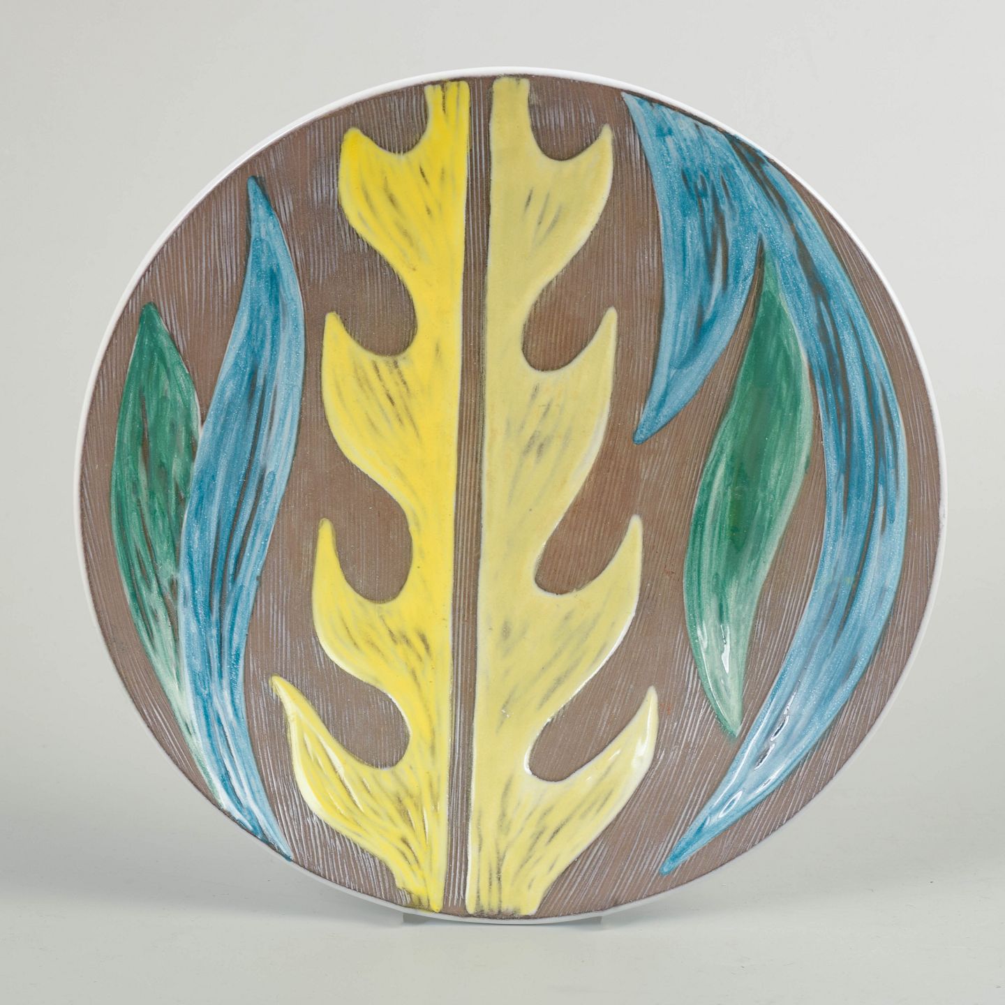 Decorative round bowl in glazed faience with a stylised agave leaf motif in yellow, blue, and green tones against a ribbed brown ground. The relief decoration is characteristic of Mari Simmulson’s graphic, nature-inspired design language from the early 1960s. The model is numbered 4445 and dated 1961.