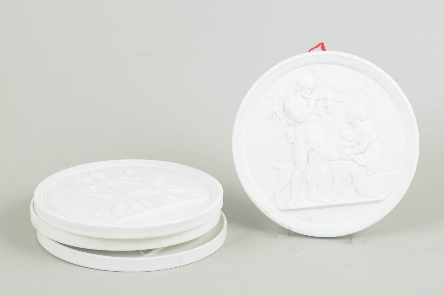White unglazed porcelain reliefs with classical motifs after Bertel Thorvaldsen, executed in fine biscuit with detailed figural decoration and suspension mounts on the reverse. First and third factory quality.