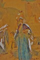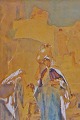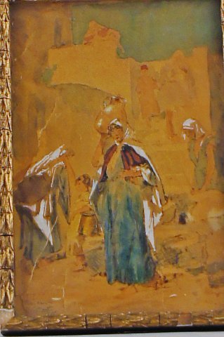 Gouache, Benjamin Constant (1845-1902) Orientalsk motiv, kvinde bærende vandkande. Gouache på papir, i god stand, lettere revnet papir (kan restaureres) trænger til rens. Signeret Benjamin Constant 1885. 20 x 13½ cm.
