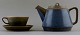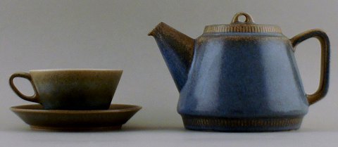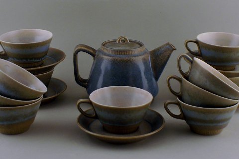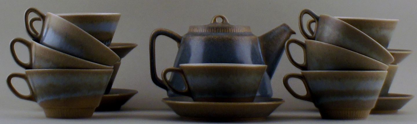 Knabstrup stentøj, theservice bestående af thekande, 9 thekopper og 5 underkopper. I perfekt stand. Stemplet.