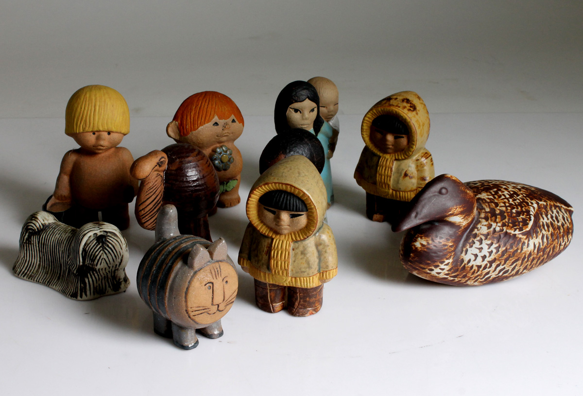 Samling Lisa Larson, figurer 2 "Syd", Nord, Øst, Vest, lille Adam og Skye Terrier. Samt Paul Hoff, Edderfugl i stentøj, længde 22 cm. Alle i god stand. Fra kr. 400 pr. stk. Kat og dromedar solgt.