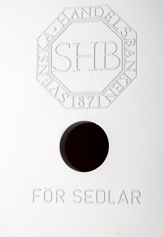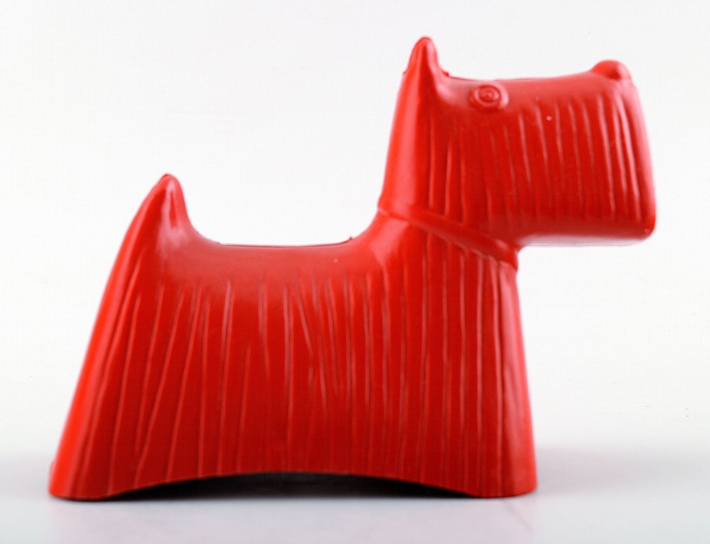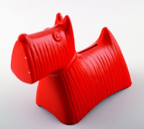 Stig Lindberg sparebøsse, rød skotte. Fremstillet i hård plast. Designet for Handelsbankens 90 års jubilæum i 1961. 14 cm. lang og 11 cm. høj. I perfekt stand.