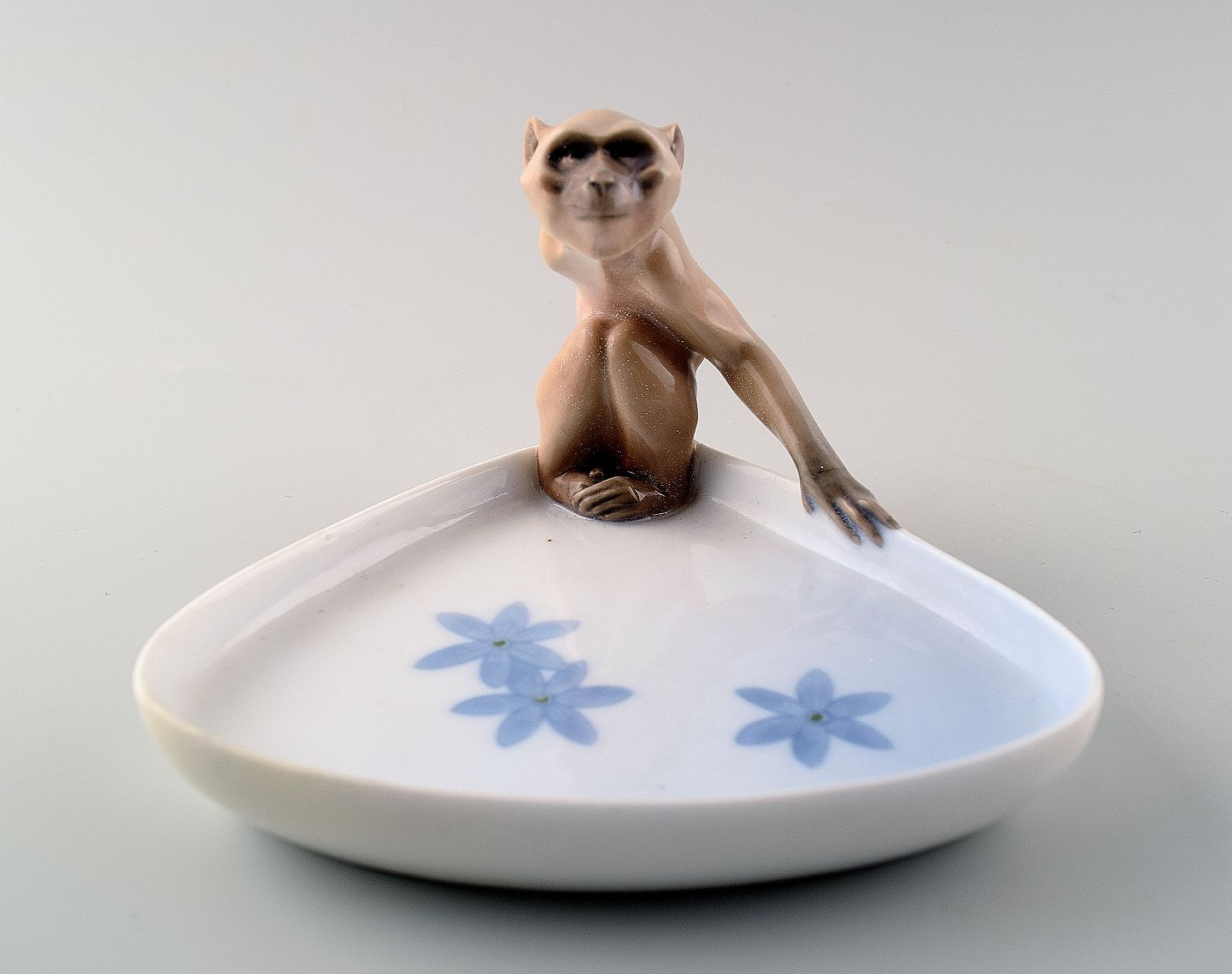 Sjælden Royal Copenhagen art nouveau fad med abe. Nummer 694/692. Måler 11 x 8 cm. I god stand, 2. sortering pga. lille brændingsfejl (håndled)
