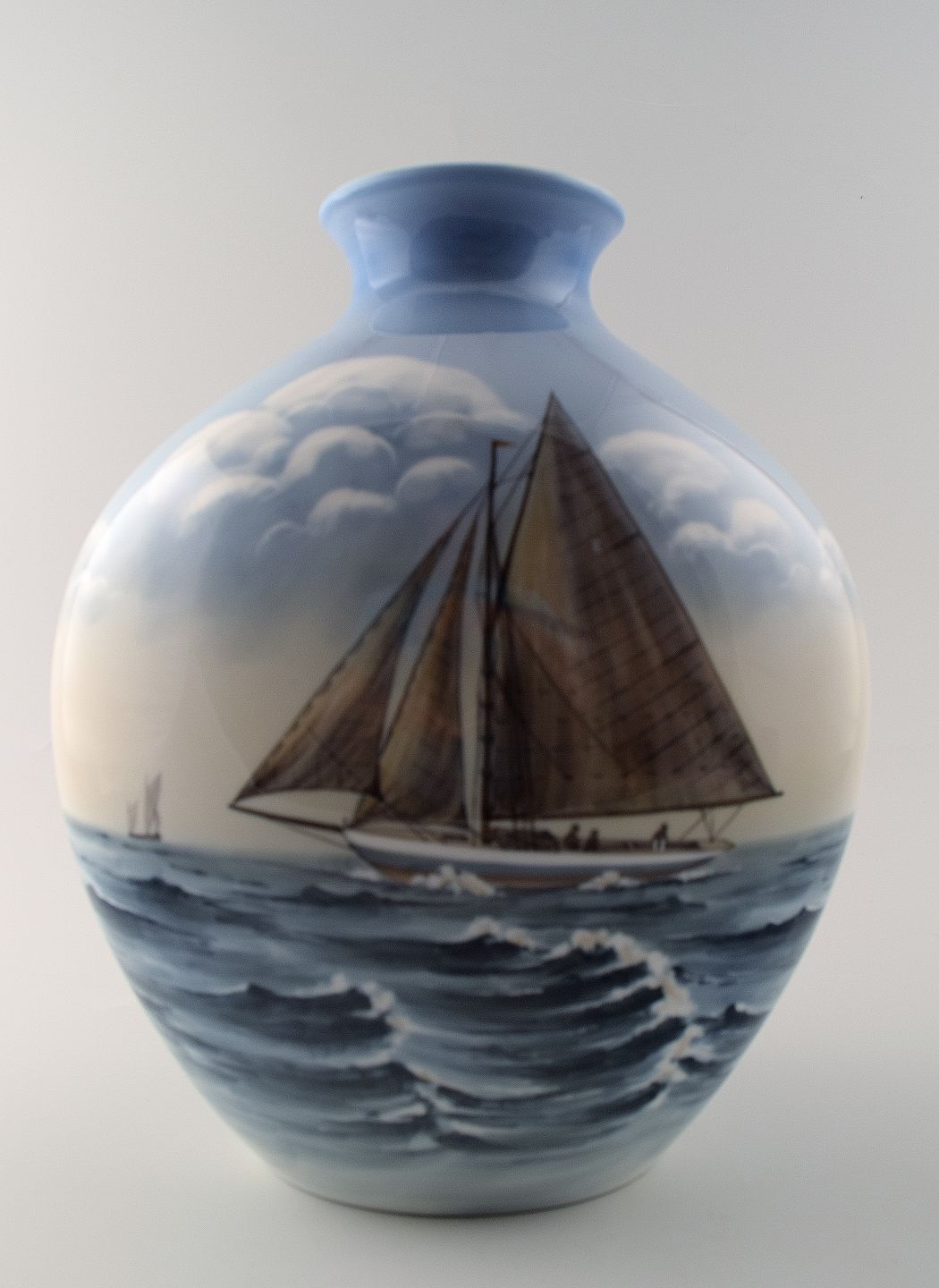 Stor B&G, Bing & Grøndahl, porcelænsvase, sejlskib på havet. I perfekt stand, 1. sortering. Stemplet. Måler 32 x 24 cm.