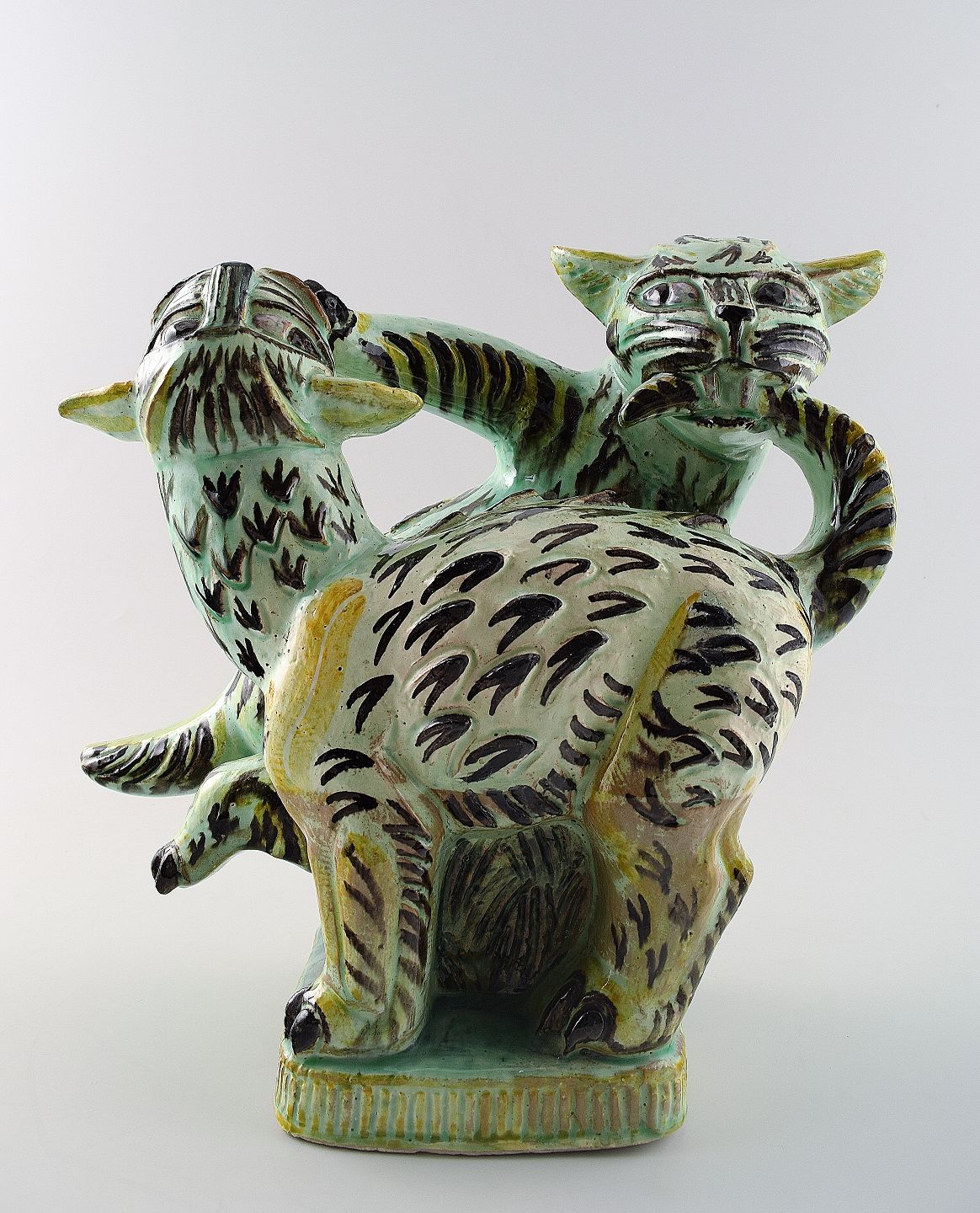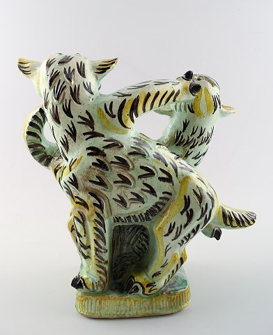 Helge Christoffersen stor unika figur af to kattedyr i leg. Skulptur i keramik af høj kvalitet, flot glasur. Eget værksted. Måler 25,5 x 27 cm. I flot stand.