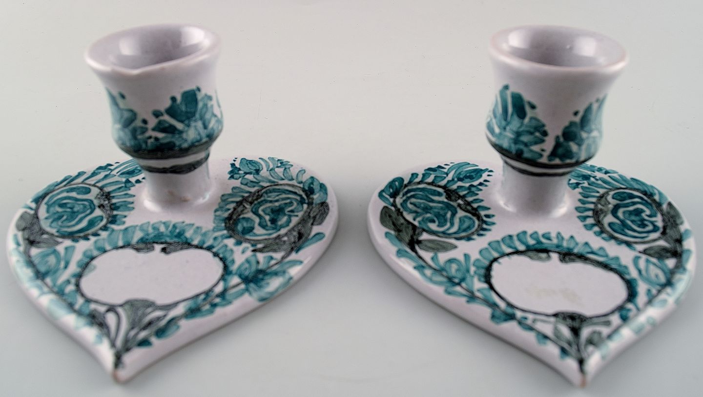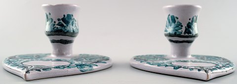 Bjørn Wiinblad par Unika lysestager fra det blå hus malet af Bjørn selv. I perfekt stand. Måler 10 x 5,5 cm. Stemplet "Glædelig jul 1999, ønsker Bjørn.