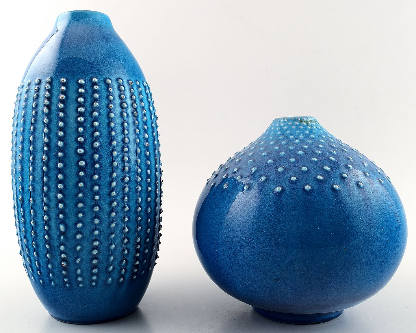 Knapstrup, to vaser af glaseret lertøj. Danmark 1960´erne. Højde 15 cm. og 23 cm. I perfekt stand. Stemplet.