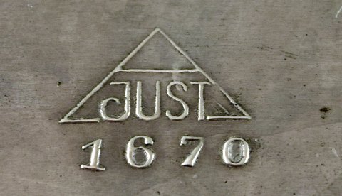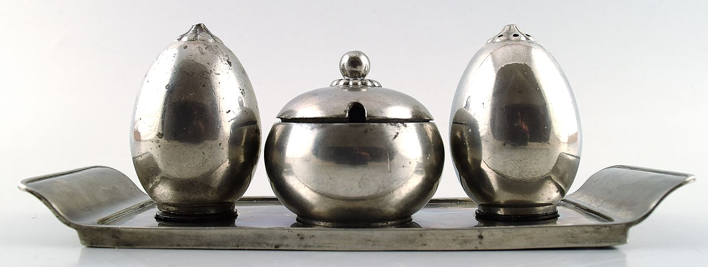 Just Andersen art deco tin plat-de-ménage på bakke med glasindsats, nummer 1670. Stemplet. Fremstår i flot stand. Måler 18,5 x 7 cm.