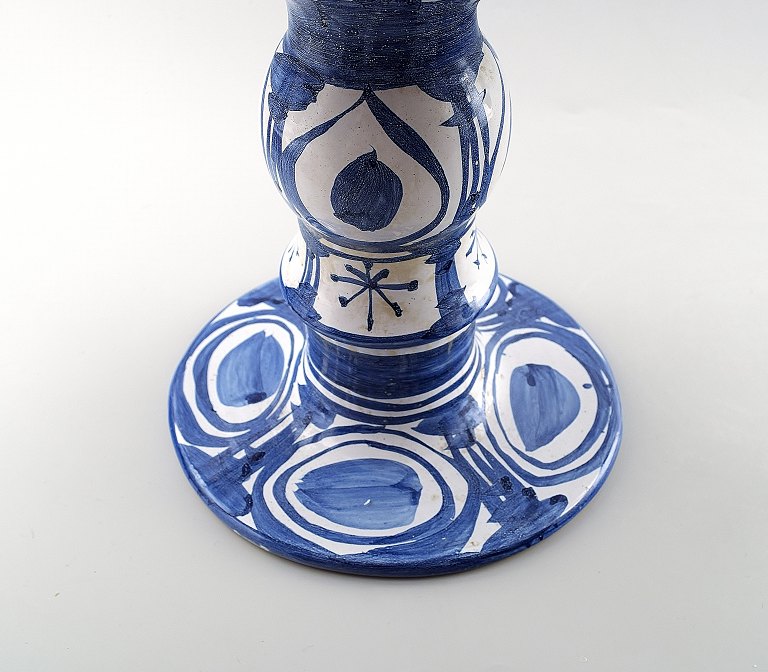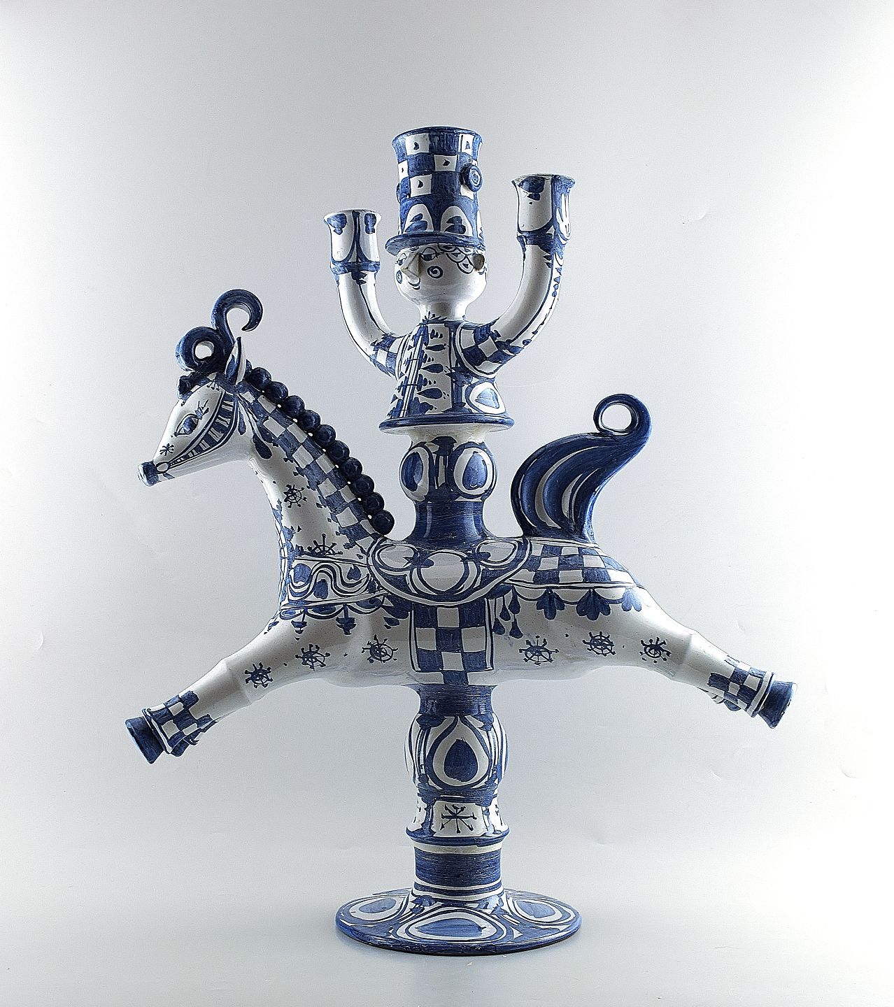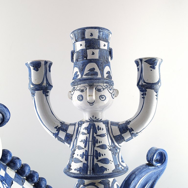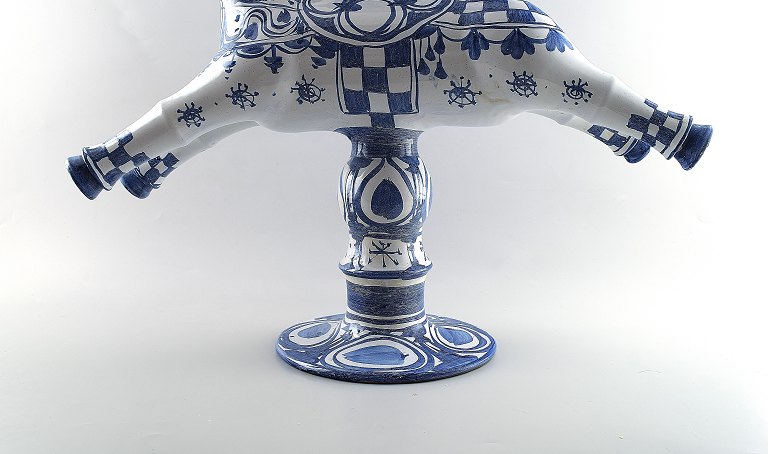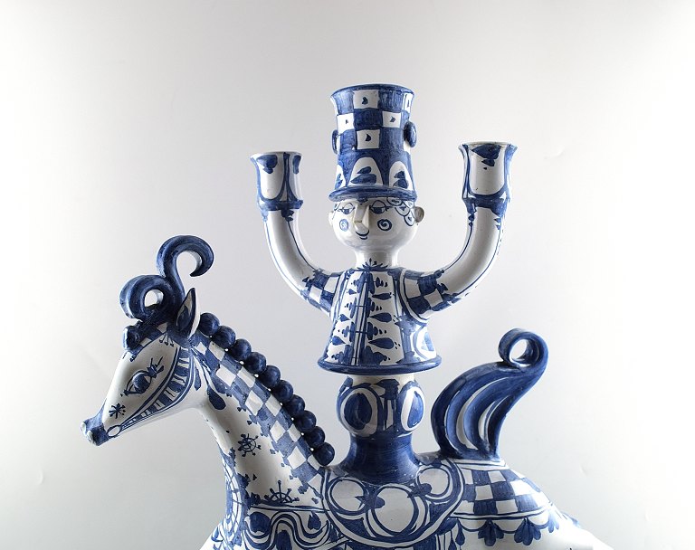 Kæmpestor Bjørn Wiinblad keramikfigur fra det blå hus. Figur / lysestage rytter til hest med plads til tre lys. Dekorationsnummer L22. Denne er fra 1972. Højde 62 cm., længde 50 cm. Perfekt stand.