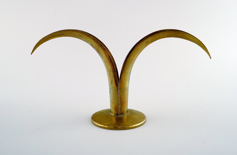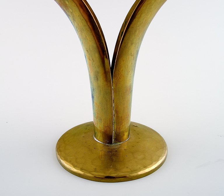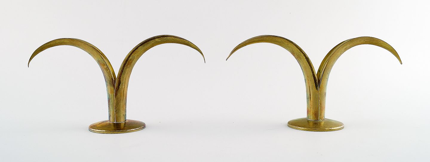 Et par lysestager i patineret messing, "Liljan", Ivar Ålenius Björk, Ystad metall. Ustemplet. 13 cm. høje og 21 cm. i diameter. Svensk designklassiker. God stand.
