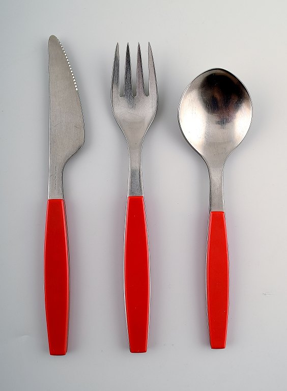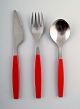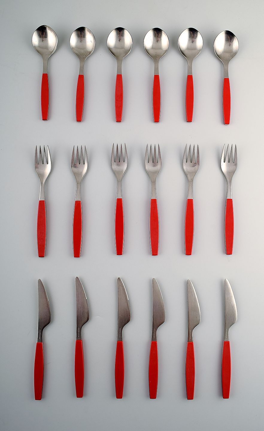 Komplet service til 6 p., Henning Koppel. Strata bestik af rustfrit stål og rød plast. Fremstillet hos Georg Jensen.