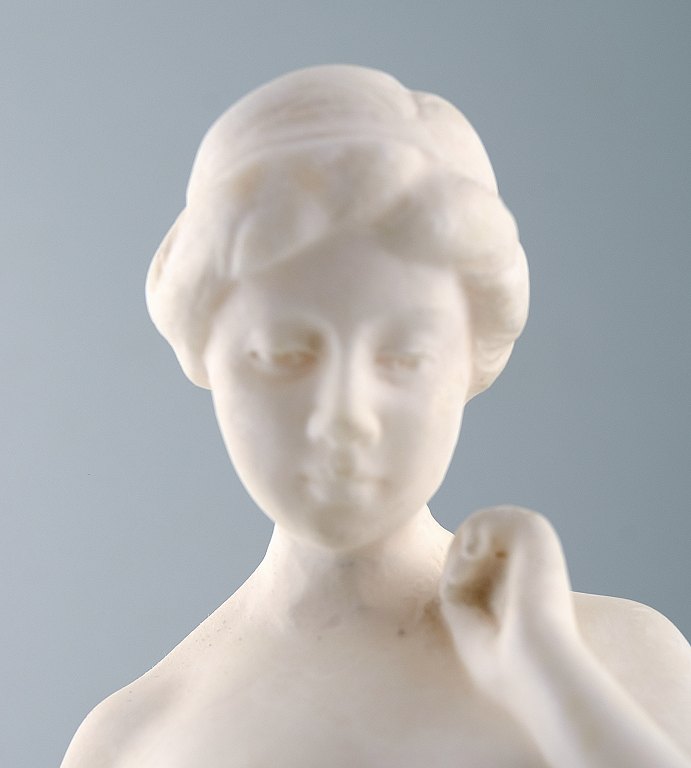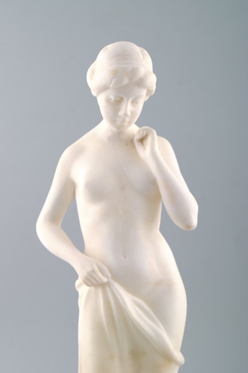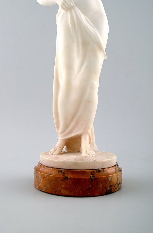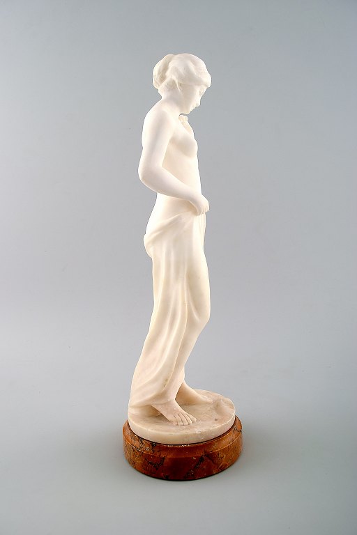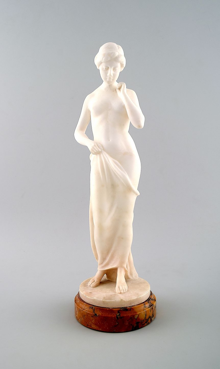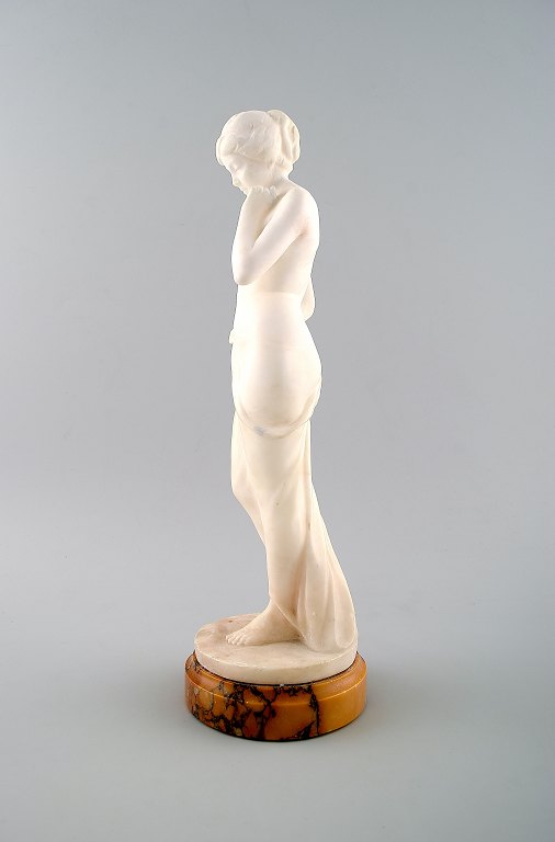 Stor figur af nøgen kvinde i alabast på marmor sokkel. Tidligt 1900-tallet. Ubekendt kunstner. Signeret : Sinter, EH. Måler : 32,5 cm. x 9 cm. I perfekt stand.