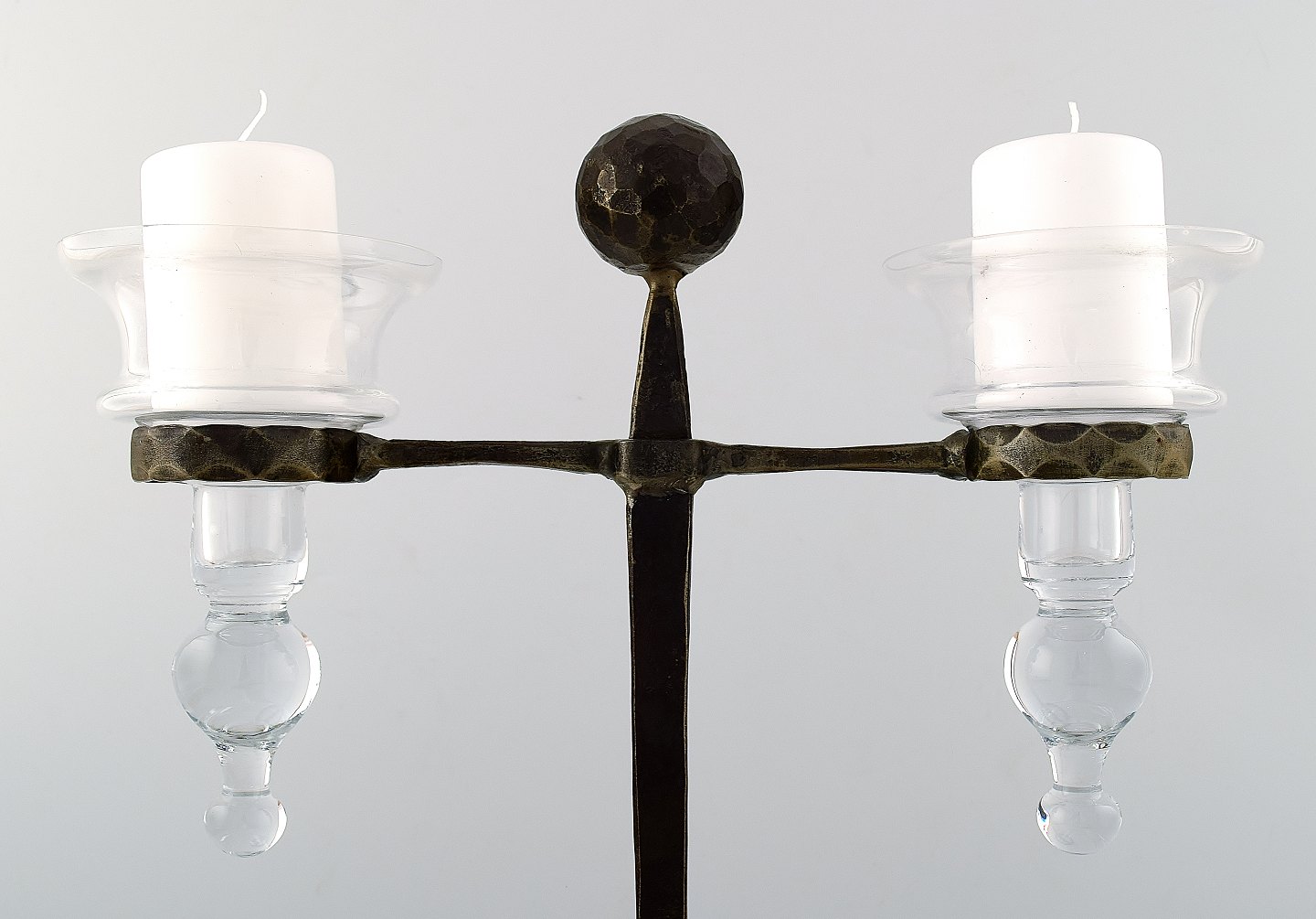 Erik Höglund for Kosta Boda. Sverige 60/70´erne. To-armet lysestage af støbejern med løse mundblæste kunstglas til lys. Måler 41 x 36 cm. I perfekt stand.