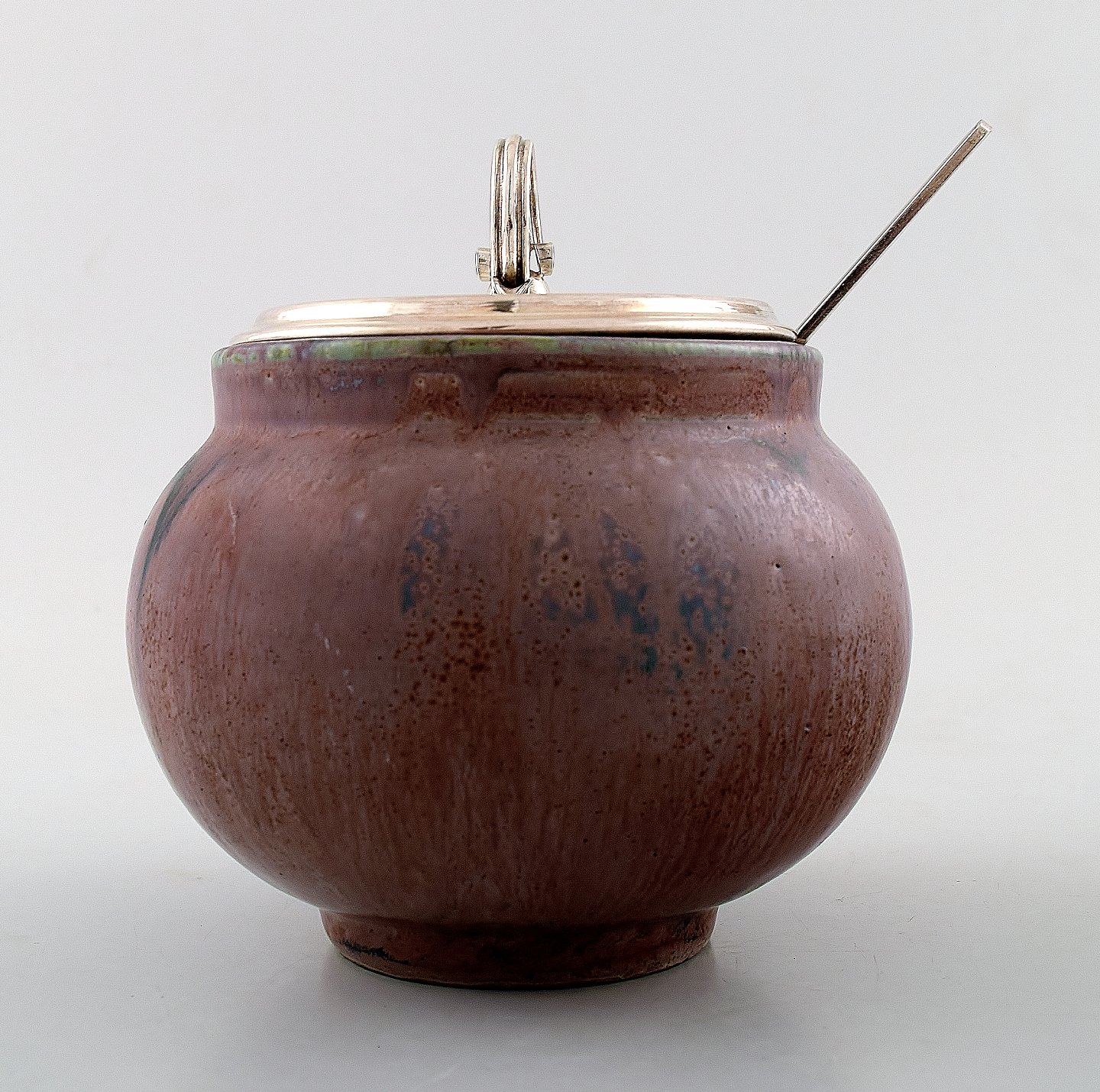 Marmeladekrukke af stentøj dekoreret med glasur i violette nuancer med blågrønne elementer.