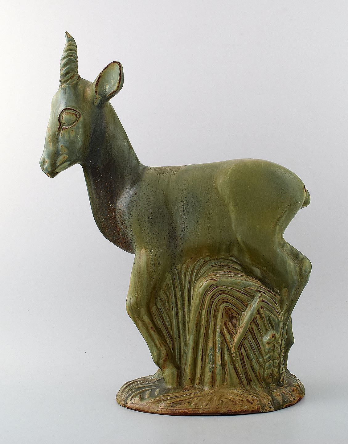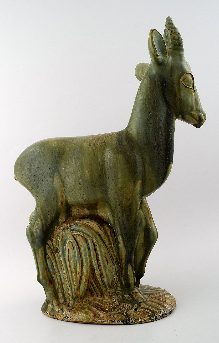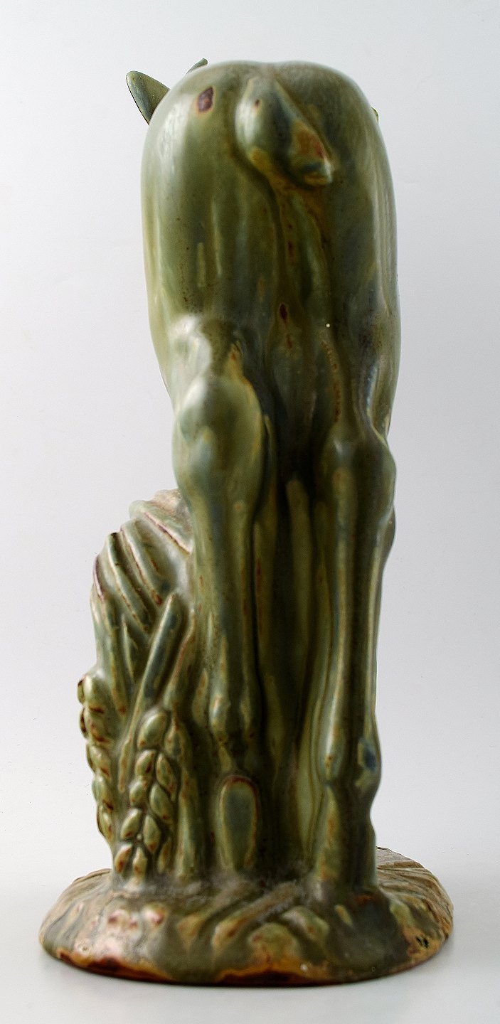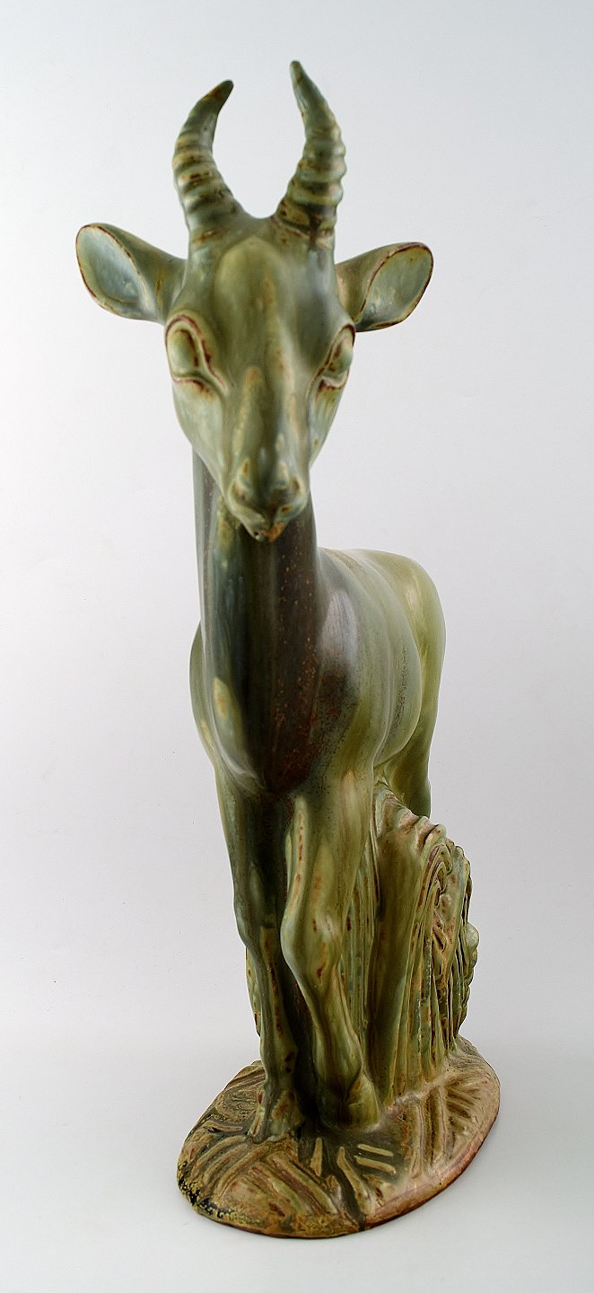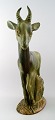 Stor og imponerende Axel Salto for Royal Copenhagen: Figur af stentøj modelleret i form af hjort. Dekoreret med lys grågrøn glasur med brune elementer. Signeret Salto. Højde 40,5 cm. I perfekt stand.
