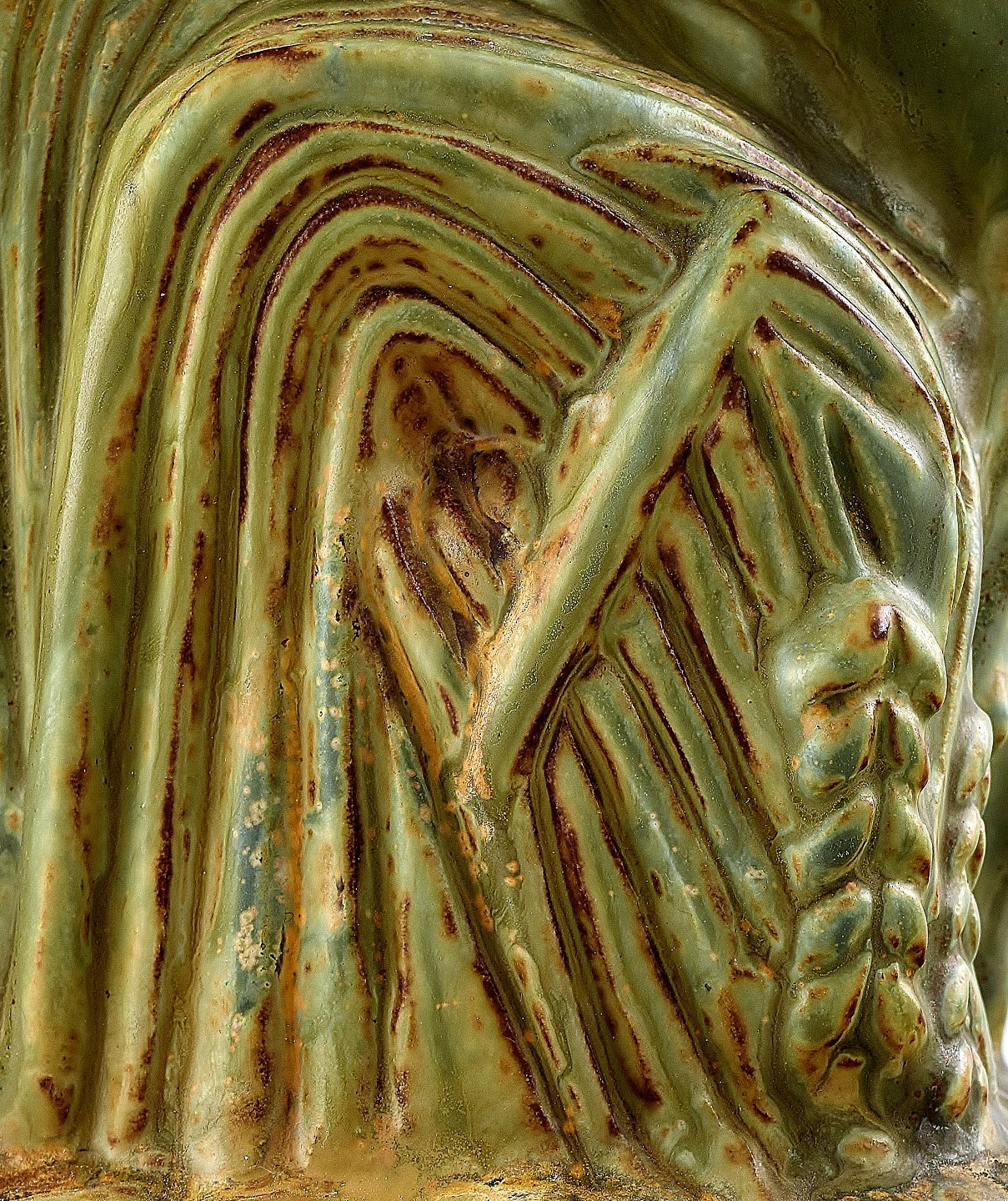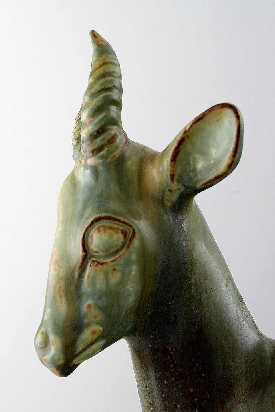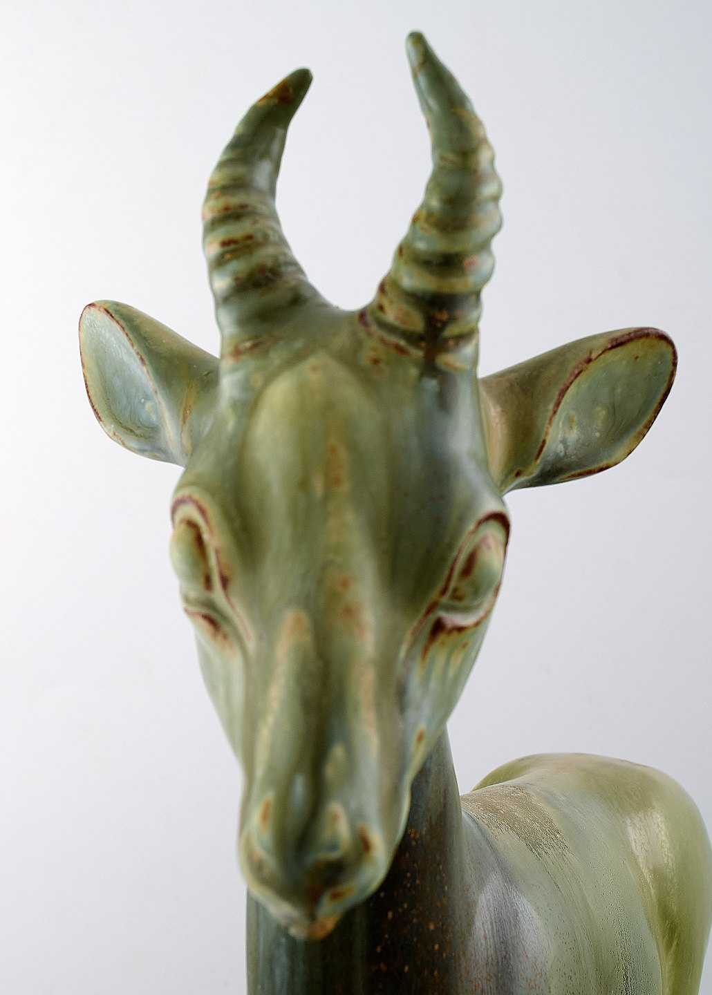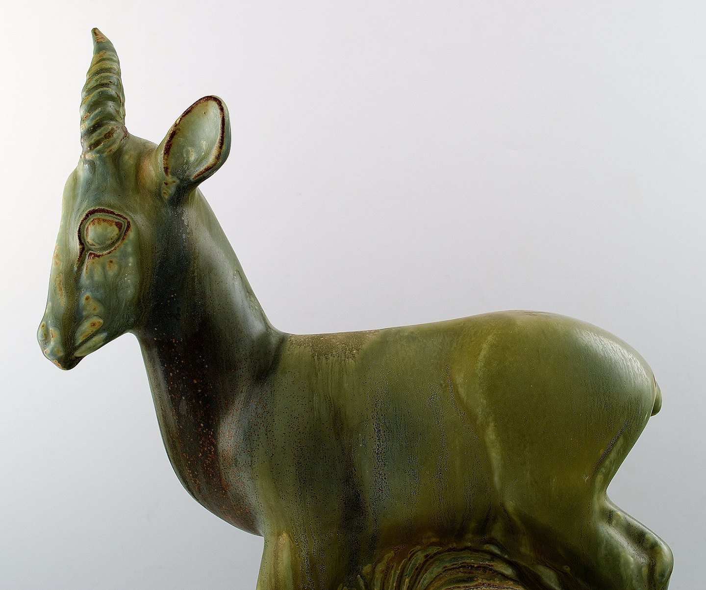Stor og imponerende Axel Salto for Royal Copenhagen: Figur af stentøj modelleret i form af hjort. Dekoreret med lys grågrøn glasur med brune elementer. Signeret Salto. Højde 40,5 cm. I perfekt stand.
