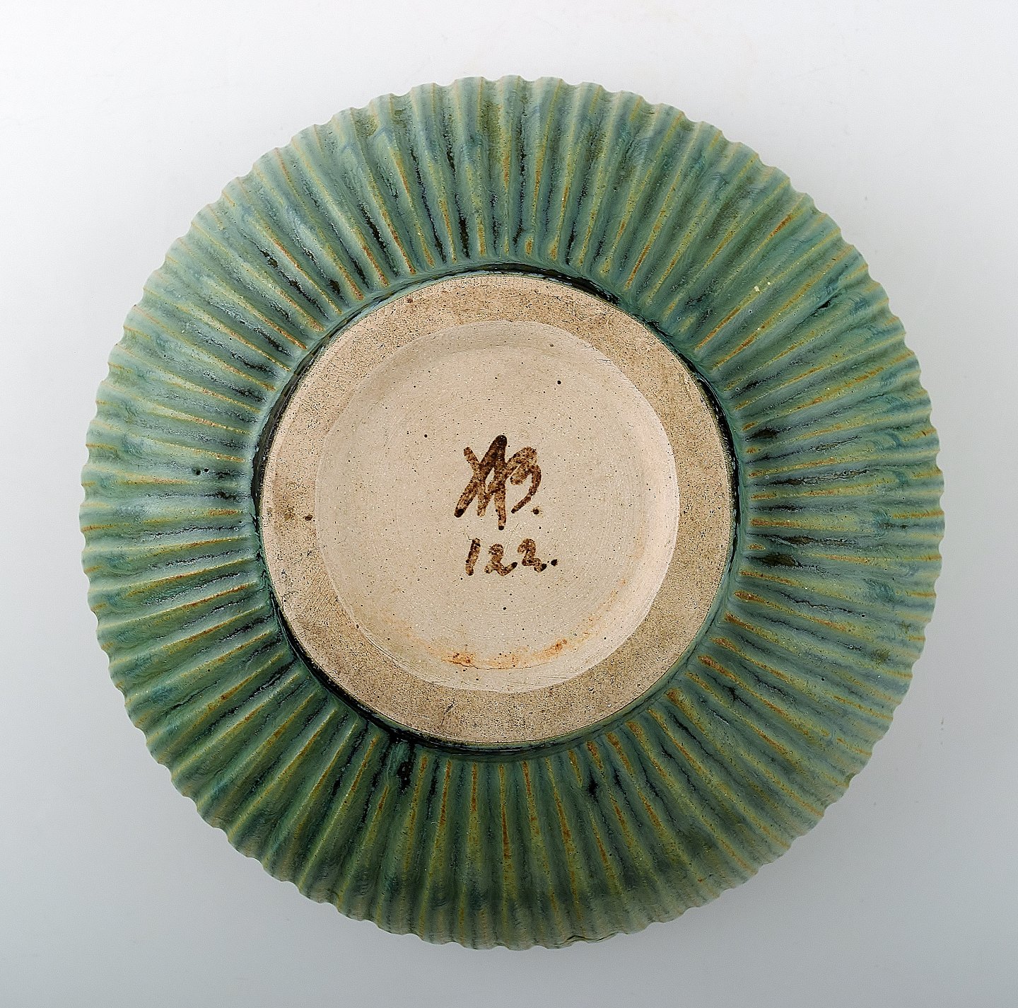 Arne Bang. Keramikskål. Stemplet AB 122. Flot glasur i grønblå nuancer. I flot stand. Højde: 10 cm. Diameter : 22 cm.