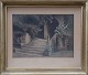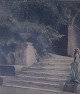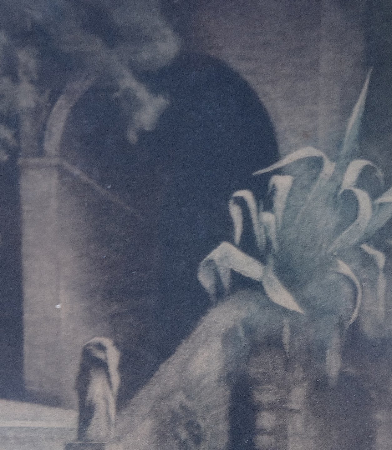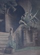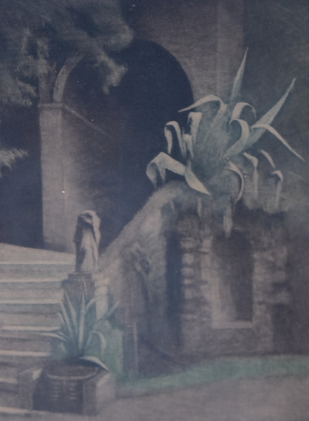 Peter Ilsted, f. Sakskøbing 1861, d. København 1933. "Fra haven i Villa d'Este". Opus 70, 1931. Betegnet Peter Ilsted. Mezzotinte i farver. Pladestørrelse 15,6 cm. x 22,3 cm. I perfekt stand.