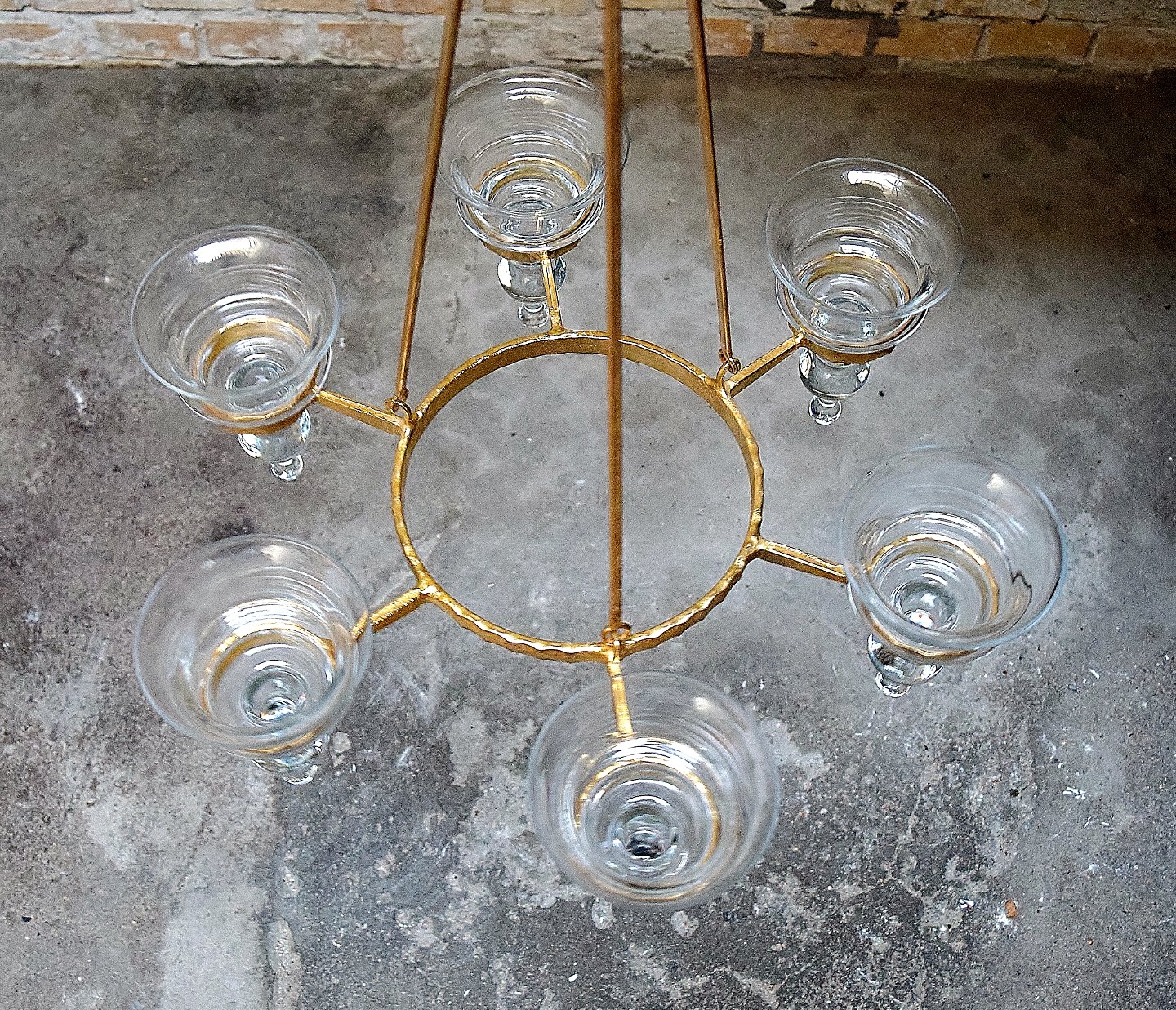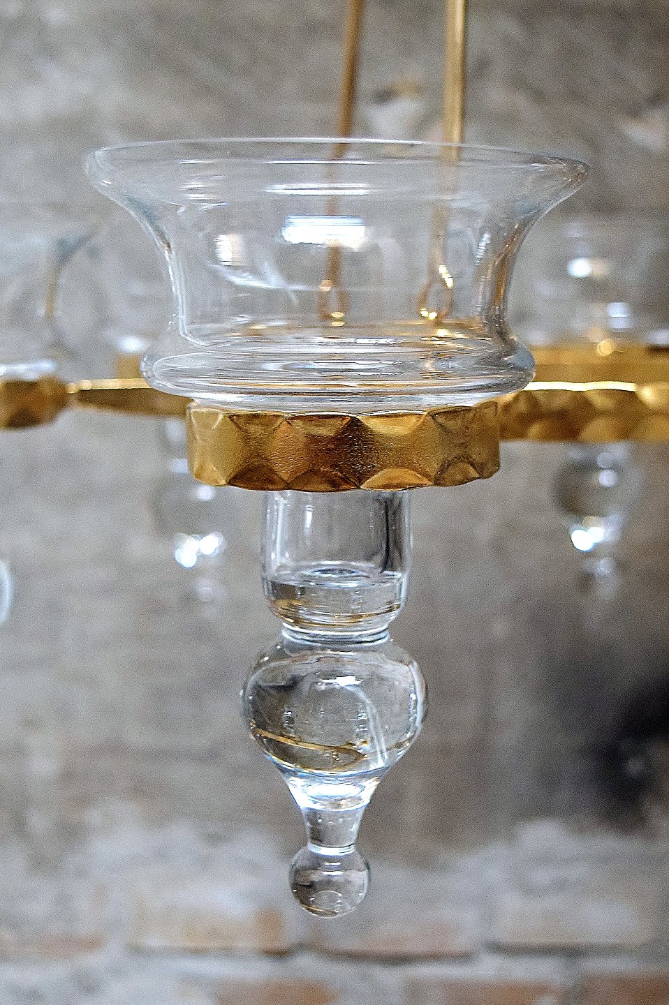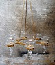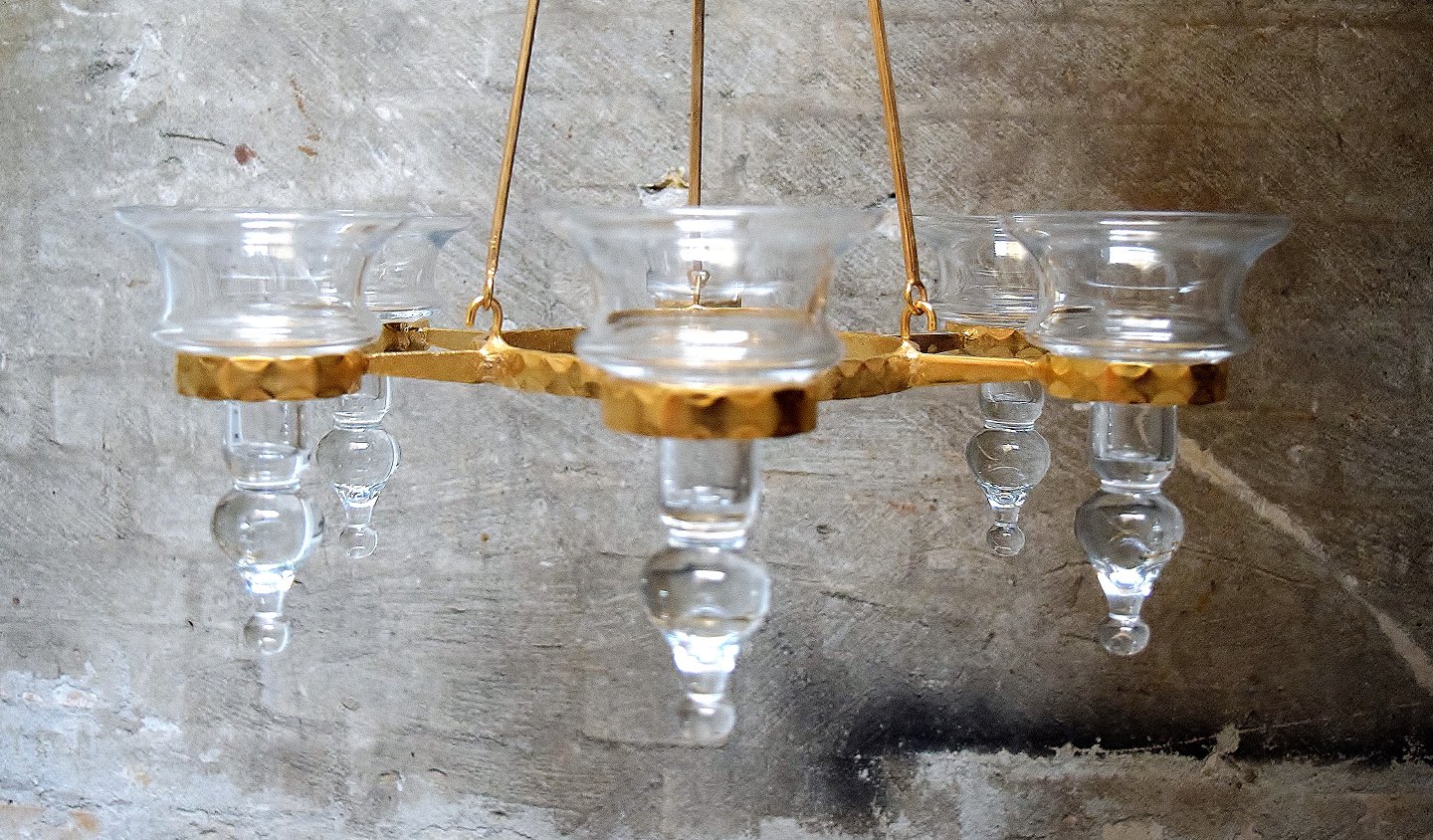 Erik Höglund for Kosta Boda. Sverige 60/70´erne. Seksarmet lysekrone af messing med løse mundblæste kunstglas til lys. Måler 85 cm. høj x 42 cm. i diameter. I perfekt stand.