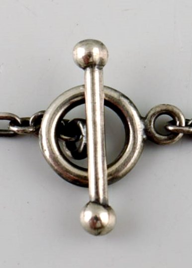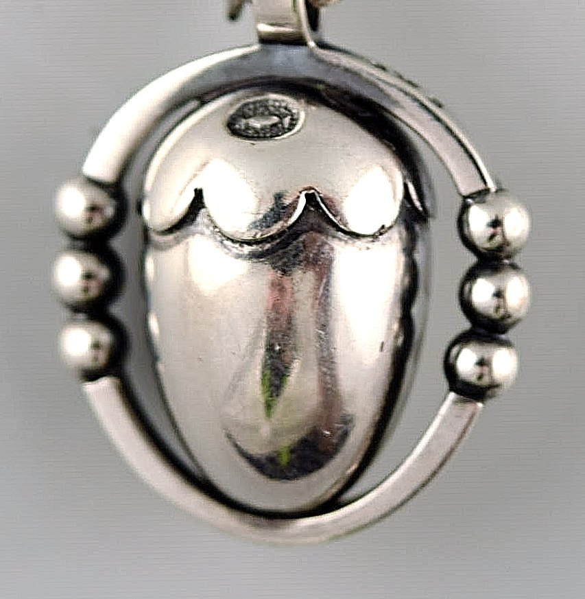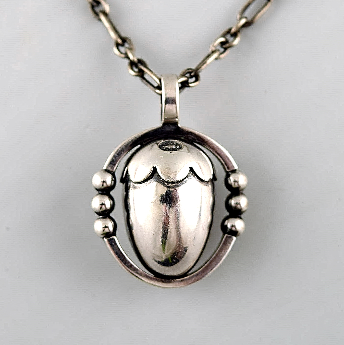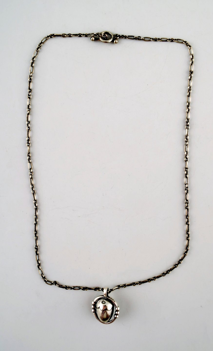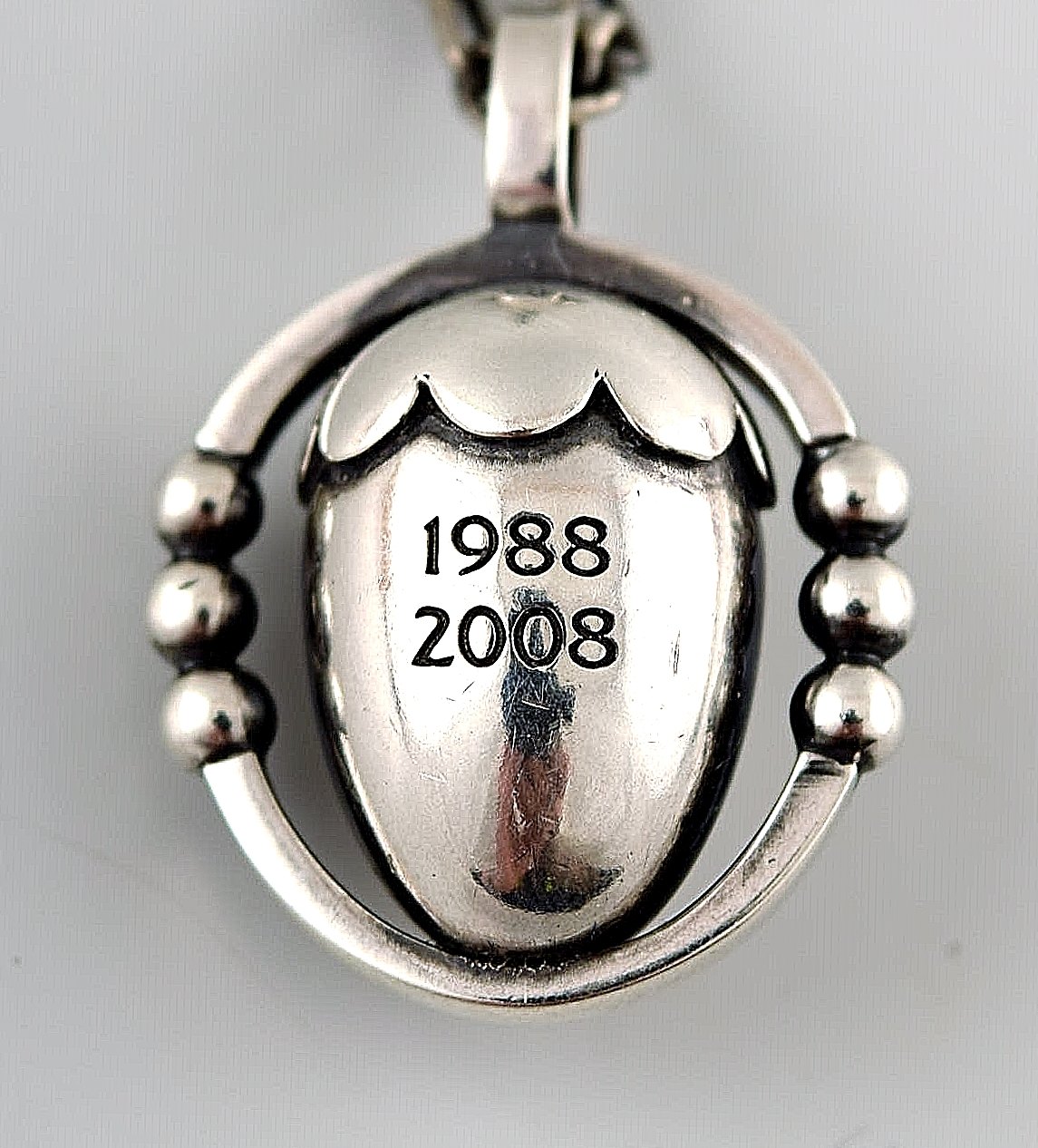Georg Jensen årssmykke i sterlingsølv med tilhørende kæde, smykket er fra 1988, er det første i rækken. Vedhænget er prydet med sølvsten, stemplet Georg Jensen, Denmark. L. ca. 49 cm. I flot stand.