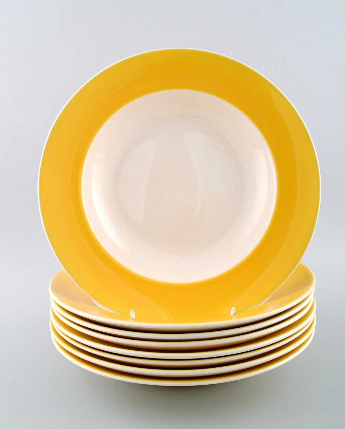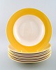 8 dybe/suppe tallerkener, Susanne Gul Confetti Royal Copenhagen/ Aluminia fajance. Måler: 23,5 x 4 cm. I flot stand. 1. sortering.