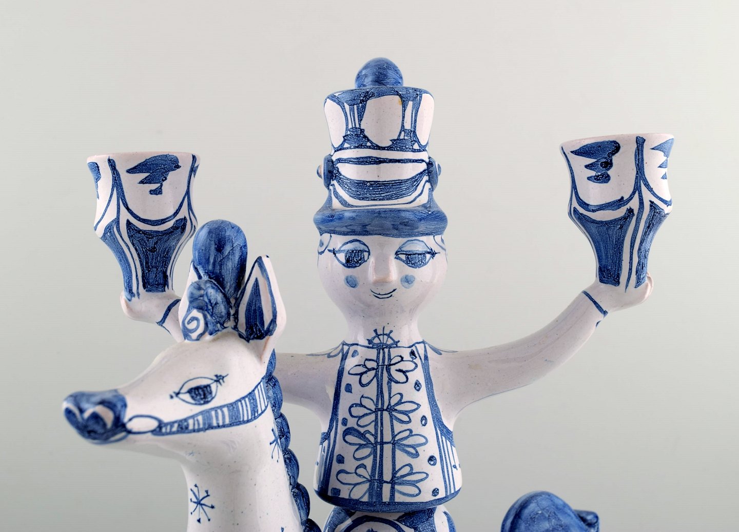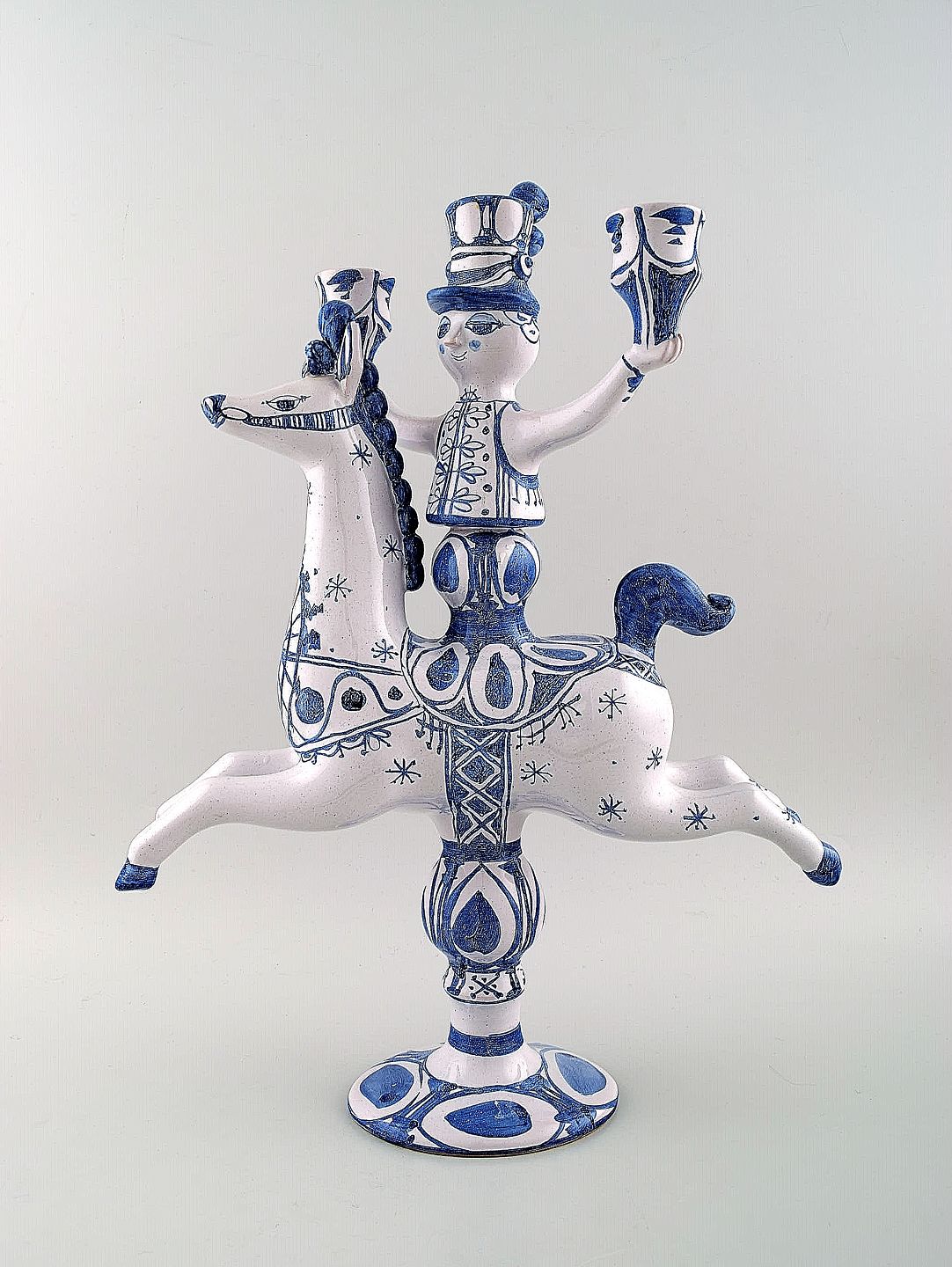 Bjørn Wiinblad stor keramikfigur fra det blå hus. Figur / lysestage rytter til hest med plads til tre lys. Dekorationsnummer L5. Denne er fra 1983. Højde 42 cm., længde 30 cm. Perfekt stand.