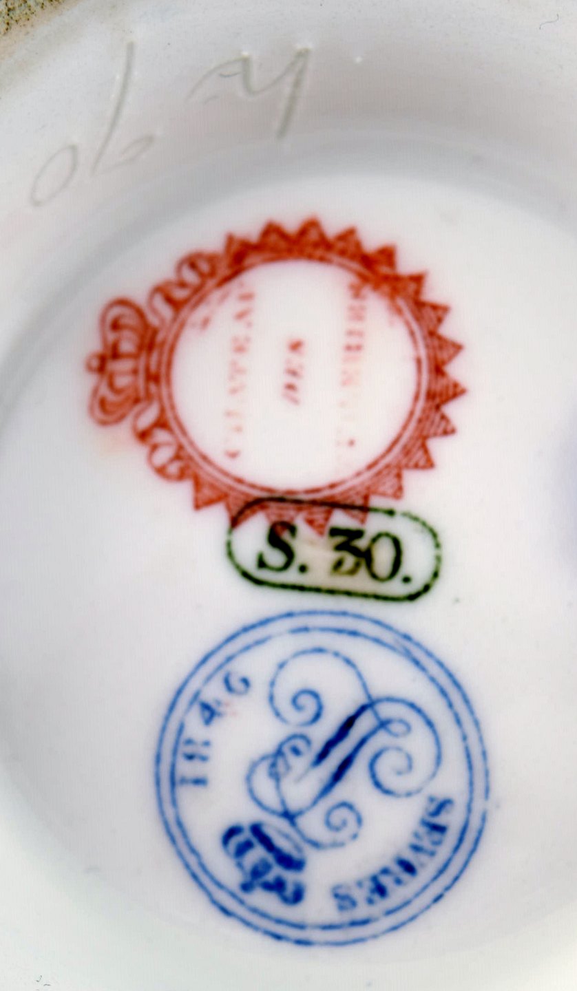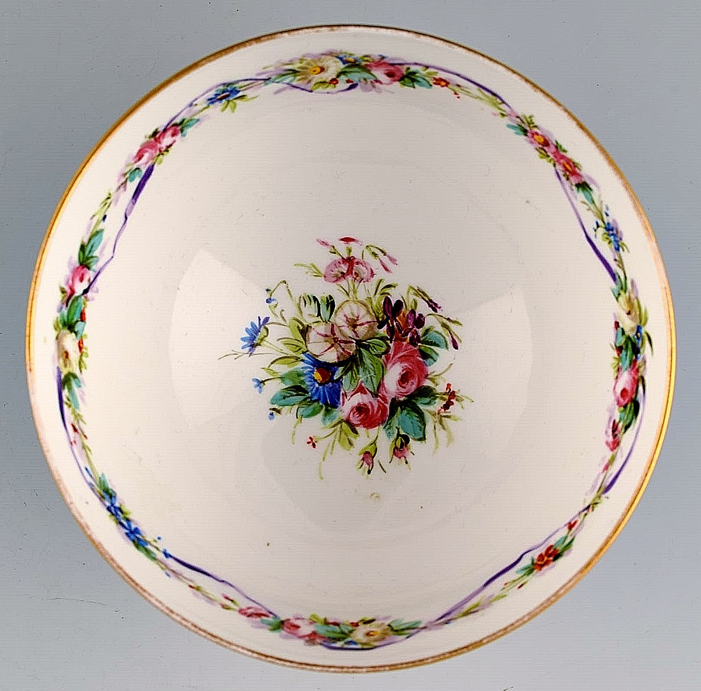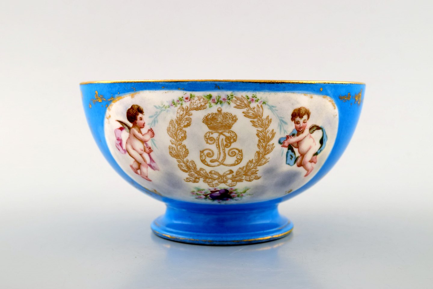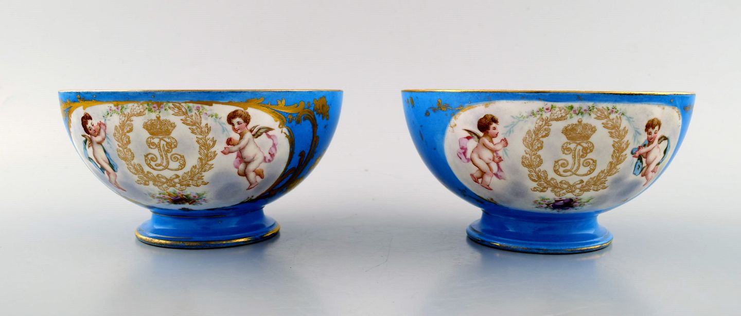 Sevres, Chateau des tuileries , Frankrig, et par skåle i Sevres-blå, håndmalet med engle og blomster. Høj kvalitet. Måler : 14 cm. x 7,5 cm. Stemplet. Dateret 1846. Chateau des tuileries. I perfekt stand.