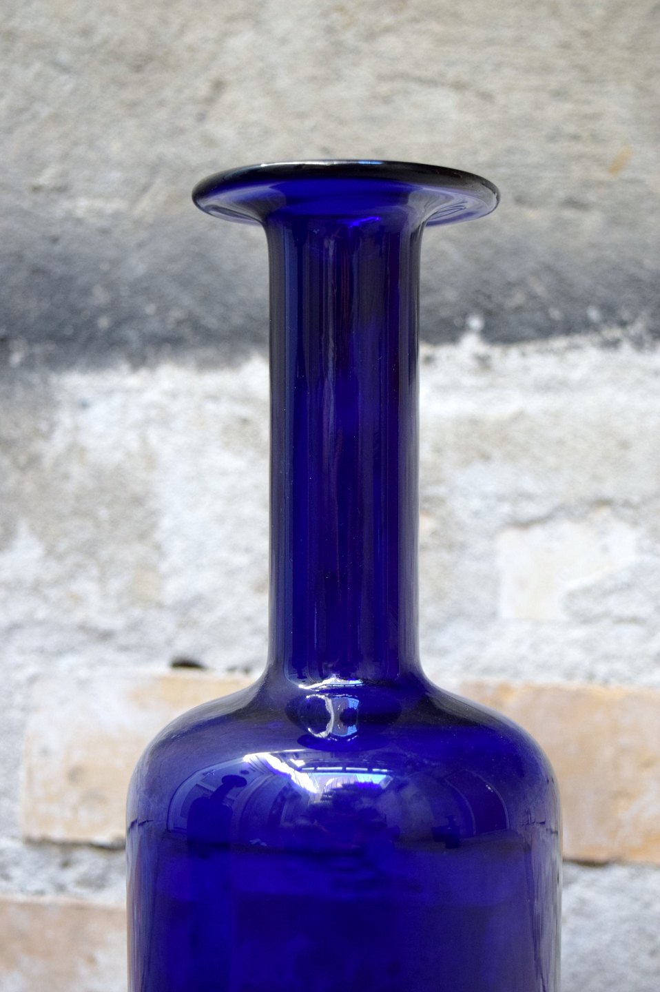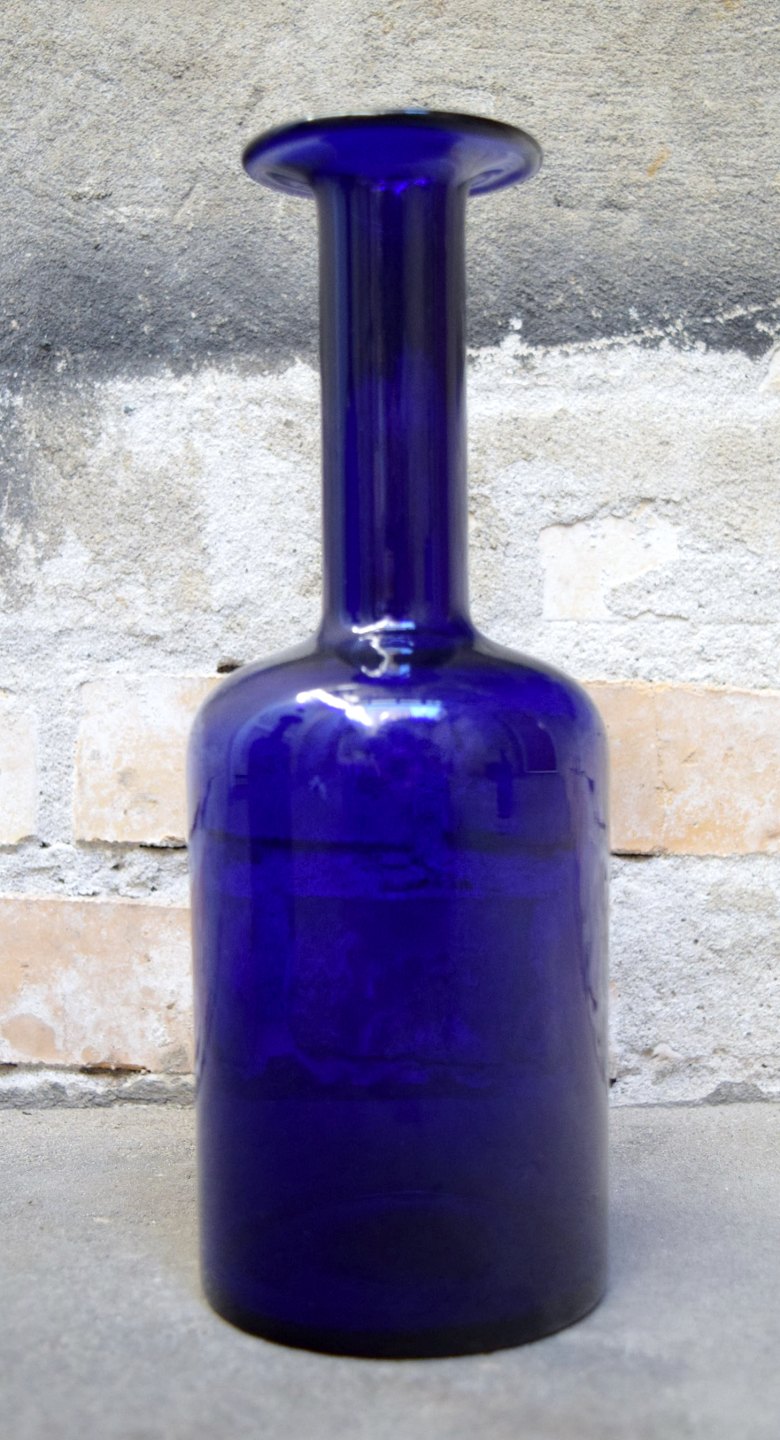 3 Holmegaard flasker i lilla, Otto Brauer. Måler : Største : 44 cm. x 17 cm. I perfekt stand.