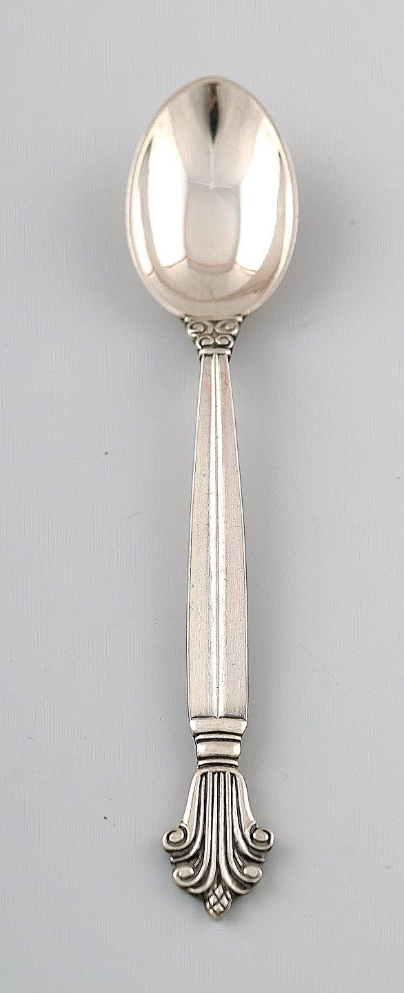 Georg Jensen sølvbestik Dronning sølvtøj, Georg Jensen. 4 Mokkaskeer. Dronningemønster Acanthus. Designet af Johan Rohde. Længde 9,5 cm. I flot stand. Tidligt stempel.