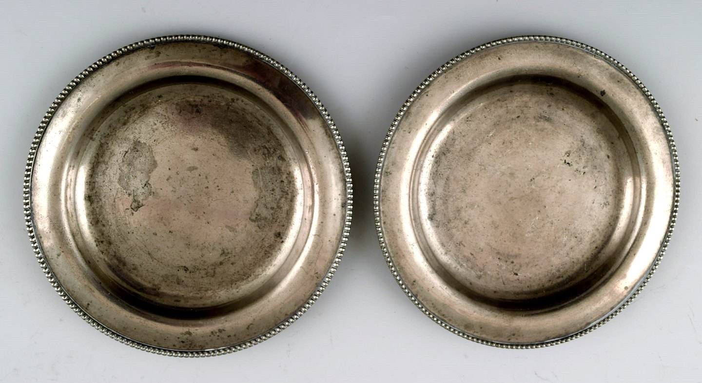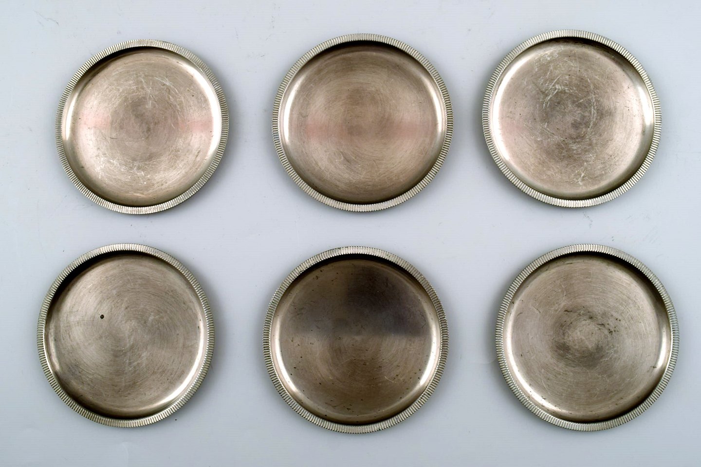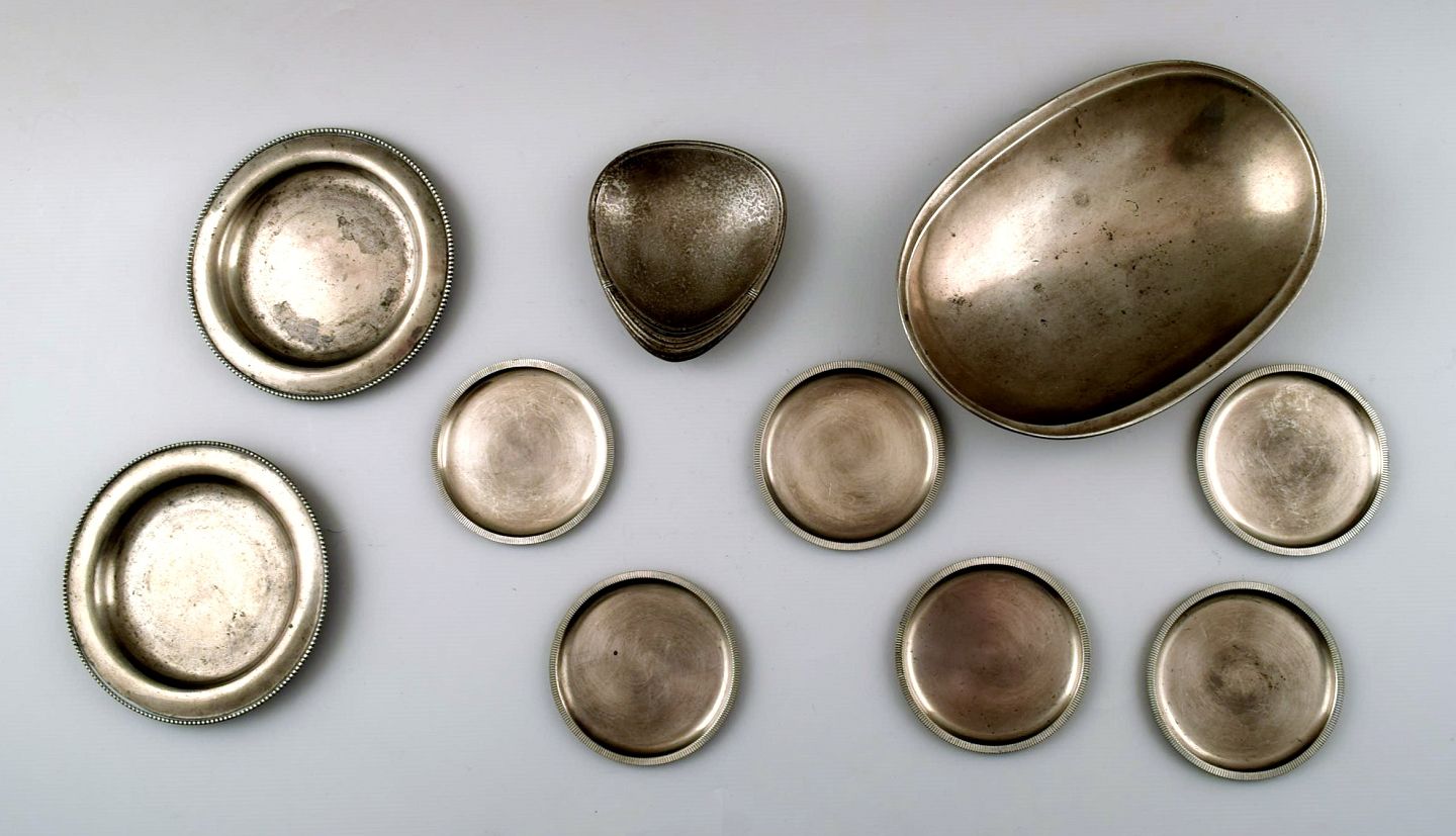 Just Andersen art deco stor samling fade og flaskebakker mm, nummer 2665 m.fl. 1930/40´erne. I alt 10 dele. Stemplet. Fremstår i flot stand. Største fad måler 18 x 3 cm.