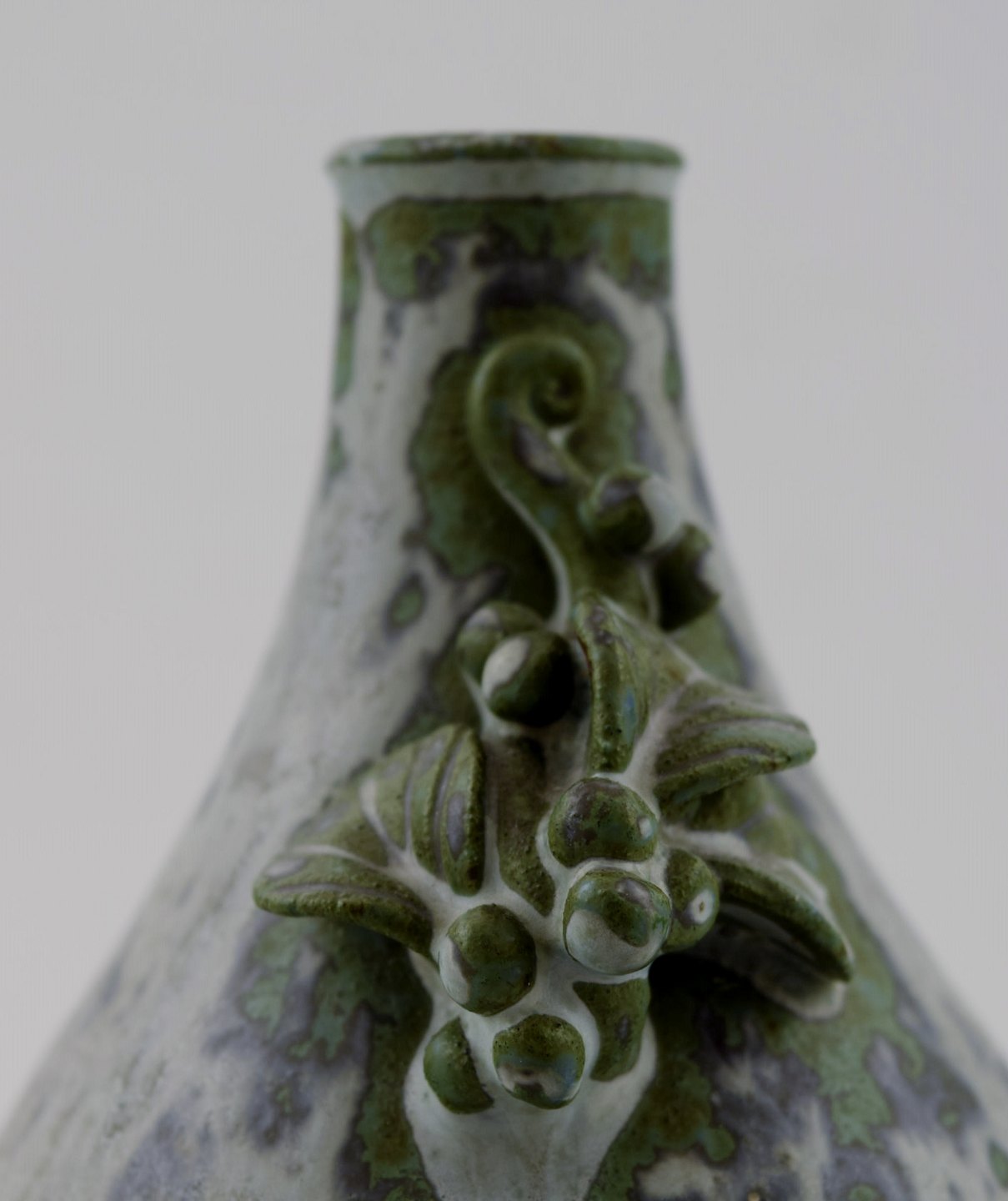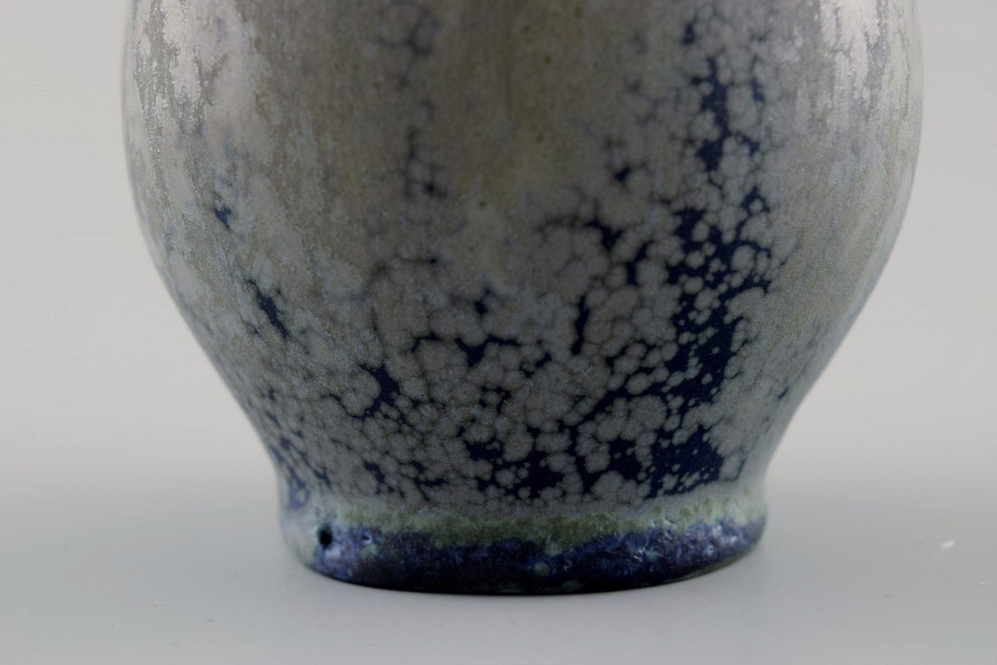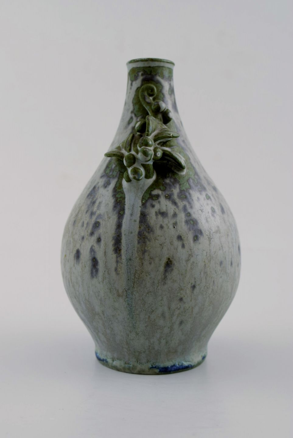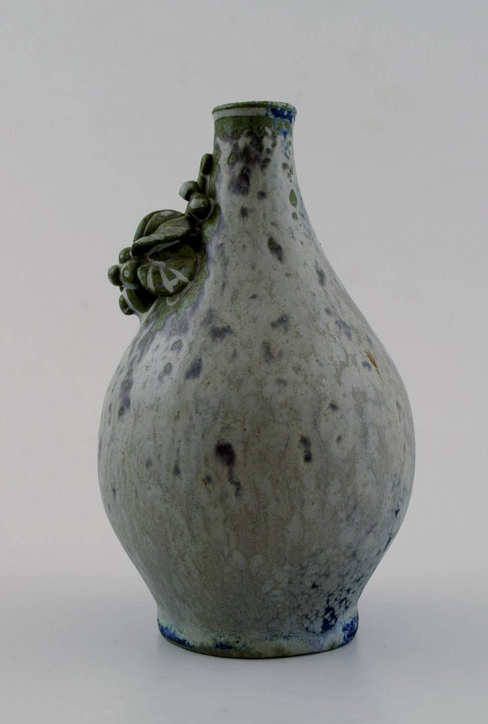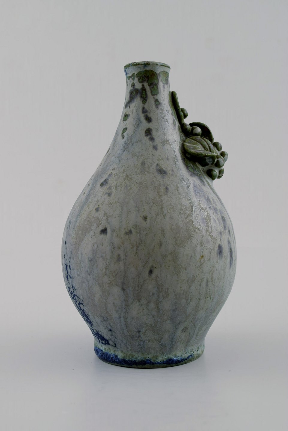 Arne Bang. Keramikvase med bladværk. Flot glasur i blå, grønne og grå nuancer. I perfekt stand. Måler: 14,5 cm. x 8,5 cm. Stemplet. AB 18.