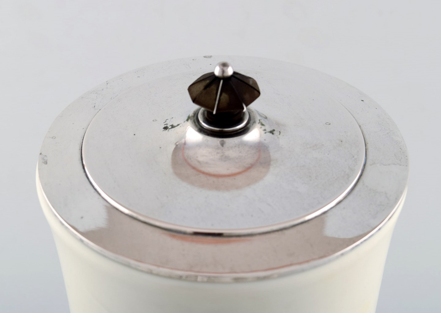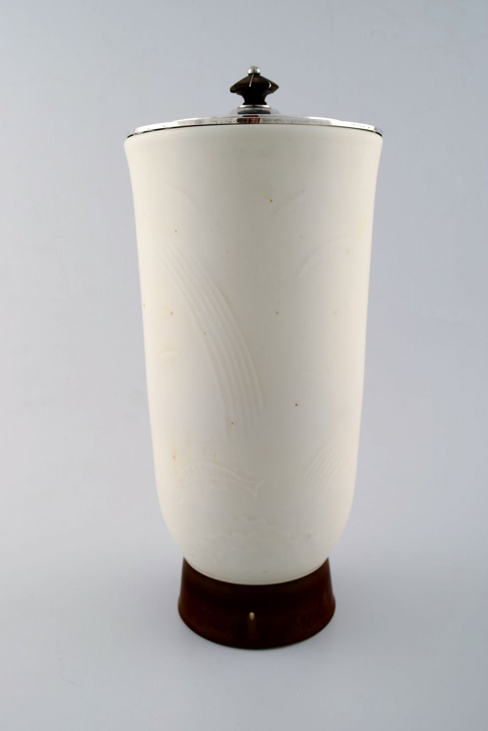 B&G, Bing & Grøndahl Art deco stor vase af porcelæn med tilhørende tretårnet sølvlåg fra Cohr, motiv af nøgen kvinde. Stemplet : B&G Måler : 35 cm. x 14,5 cm. 1. sortering, i perfekt stand.
