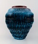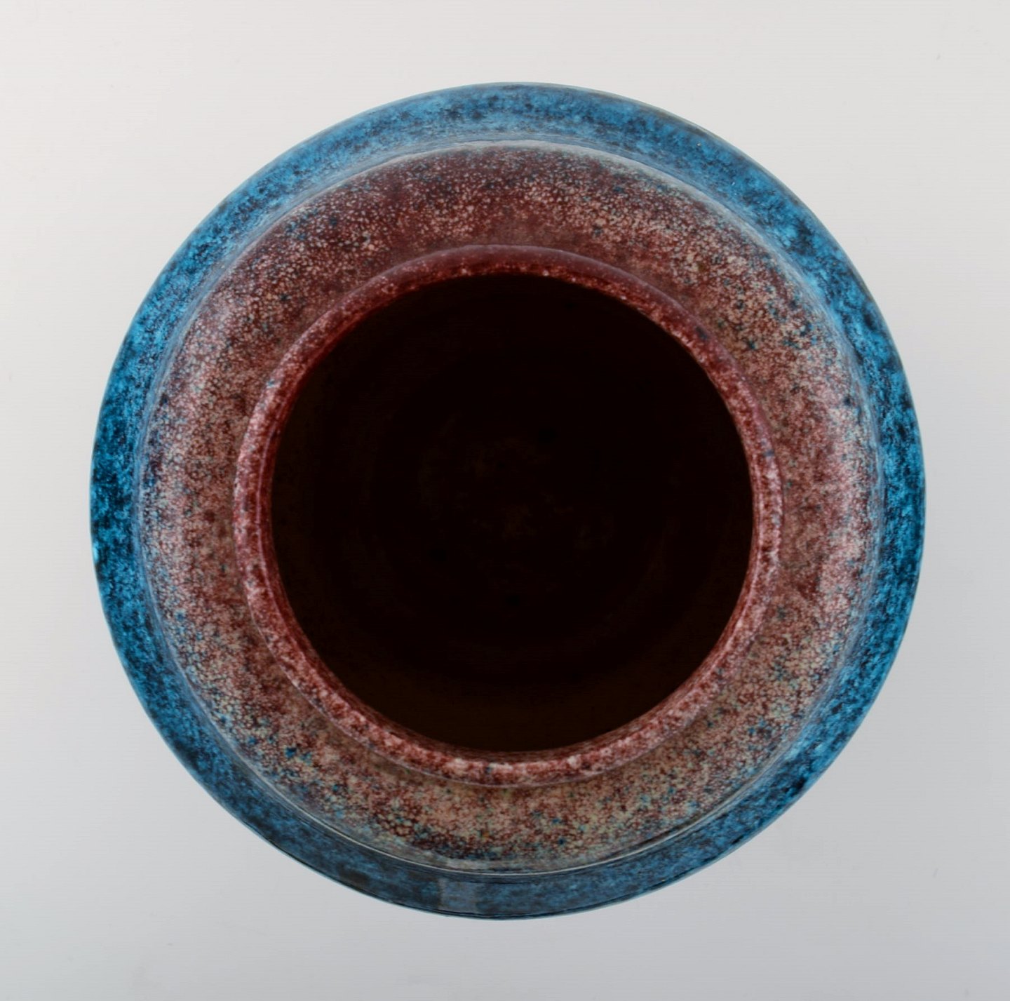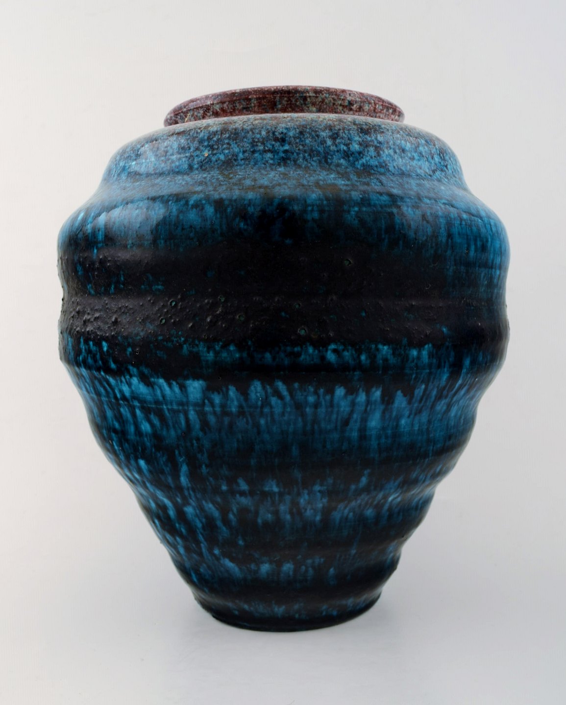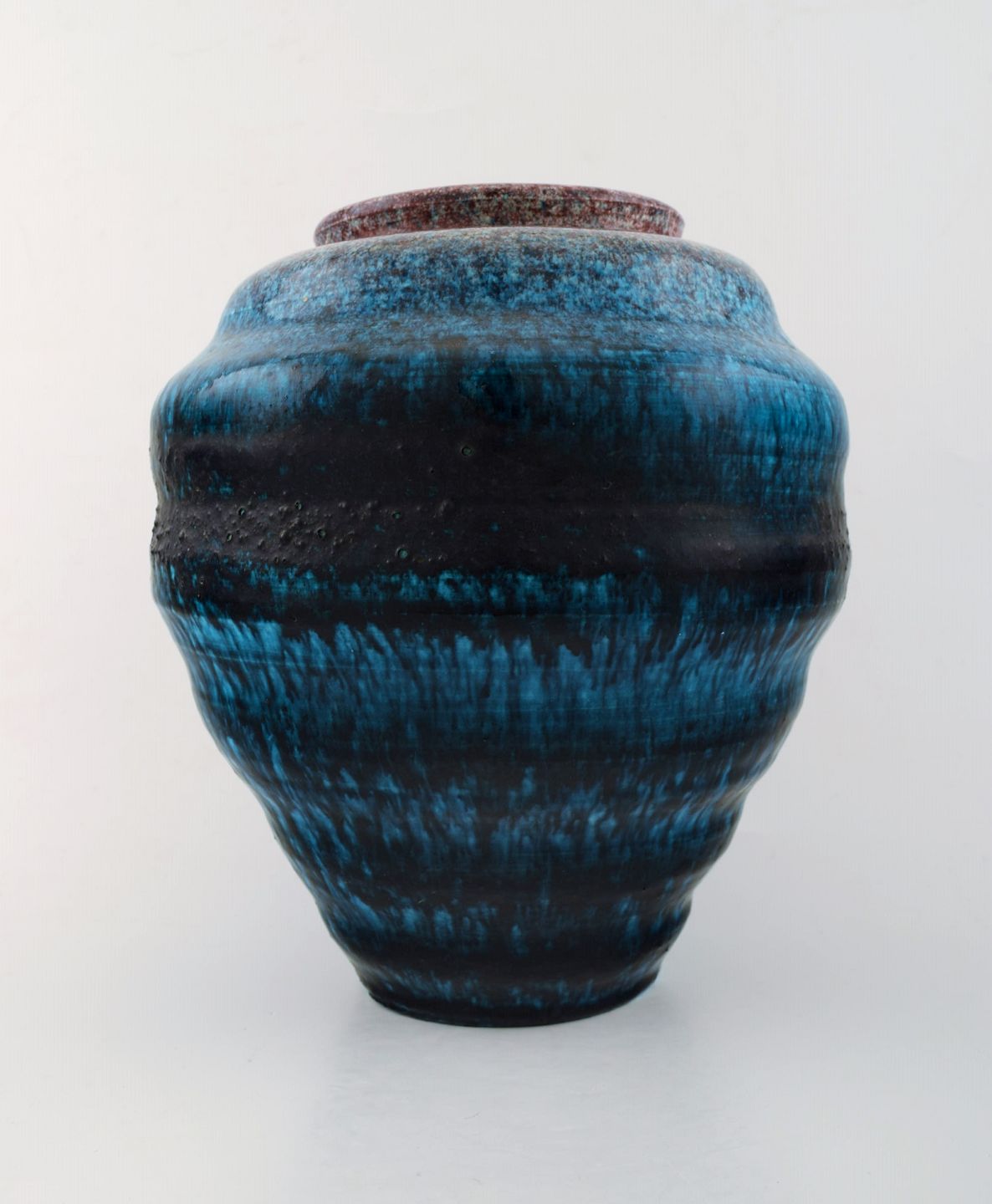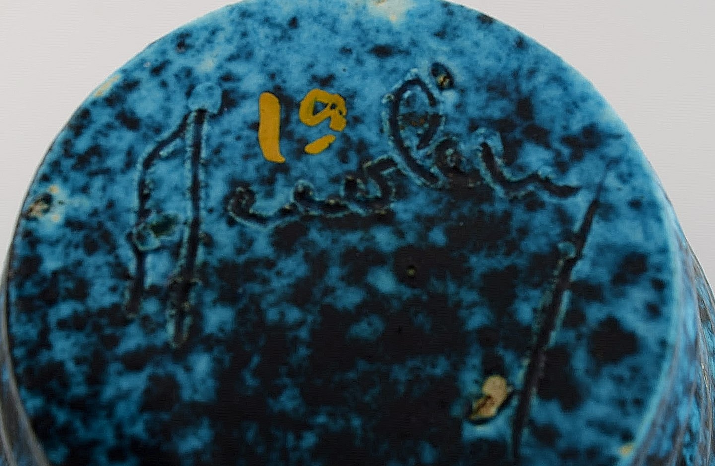 Accolay, Fransk keramikvase. Turkis, stilrent design med striber. Stemplet. Modelnummer 19. 1950/60´erne. Smuk turkis glasur. Måler 22 cm. x 20 cm. I perfekt stand.
