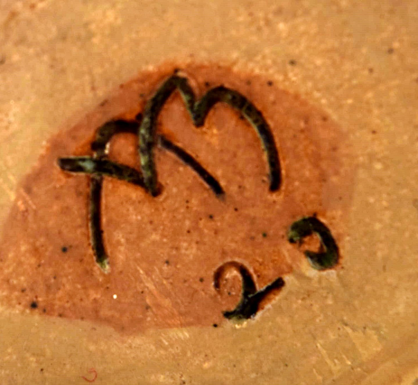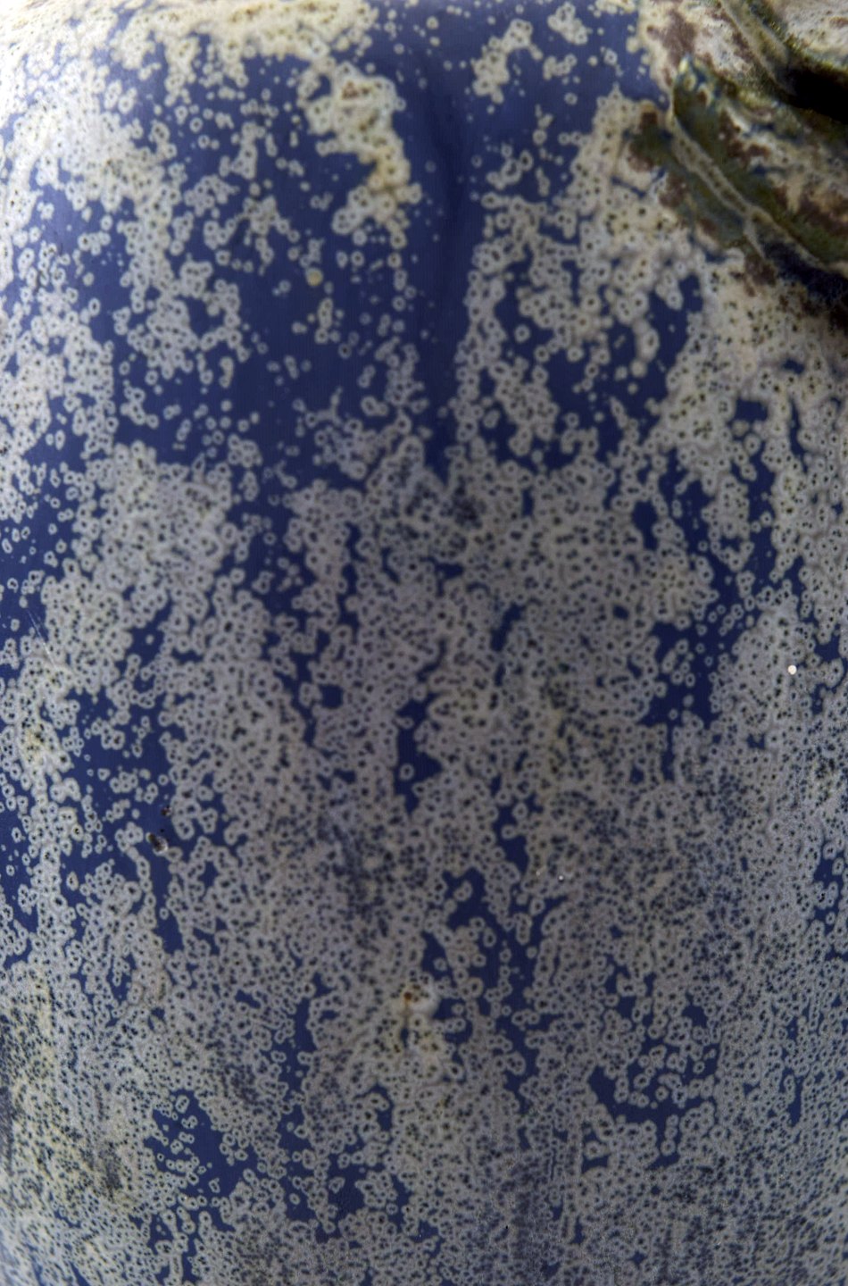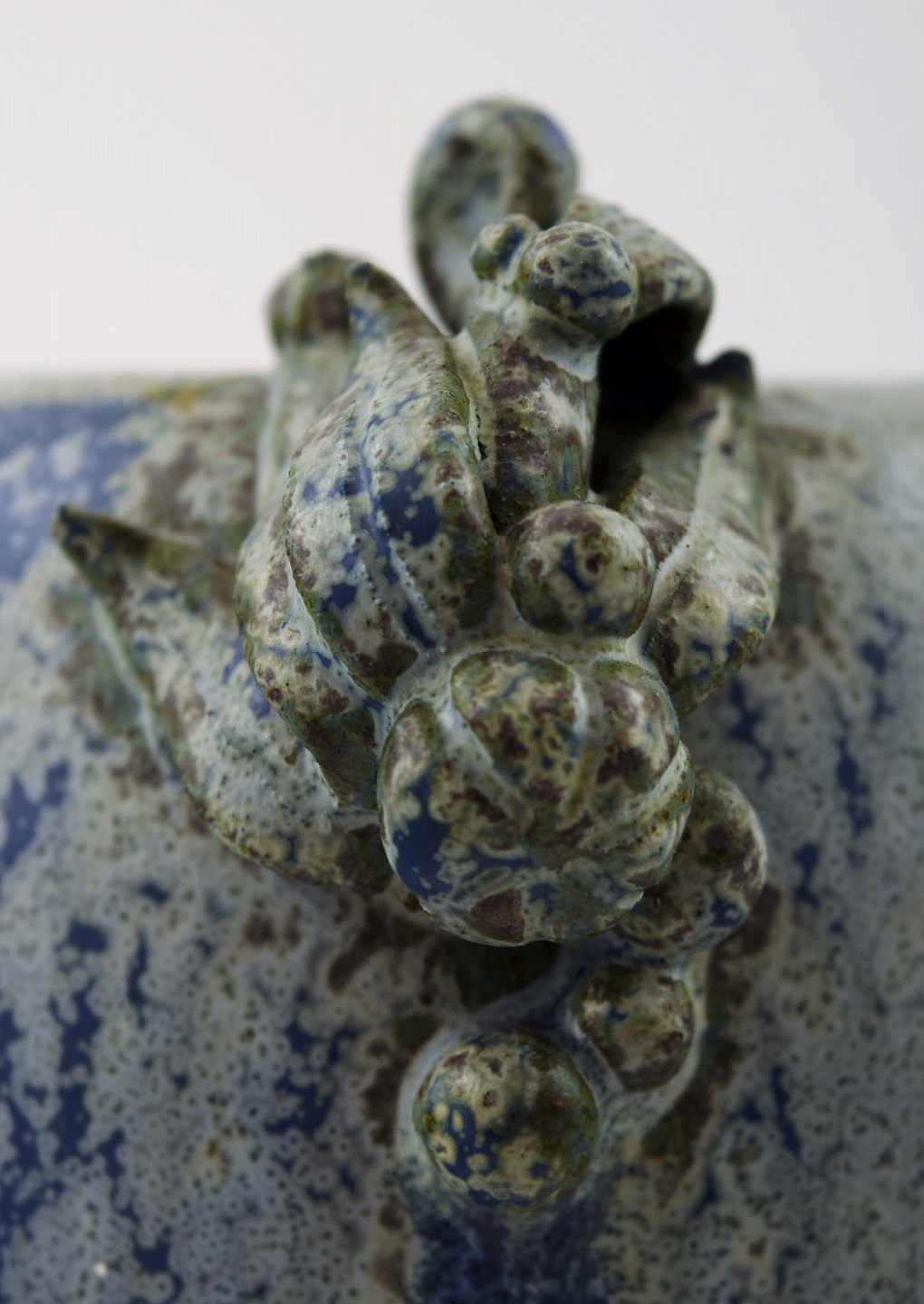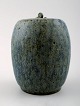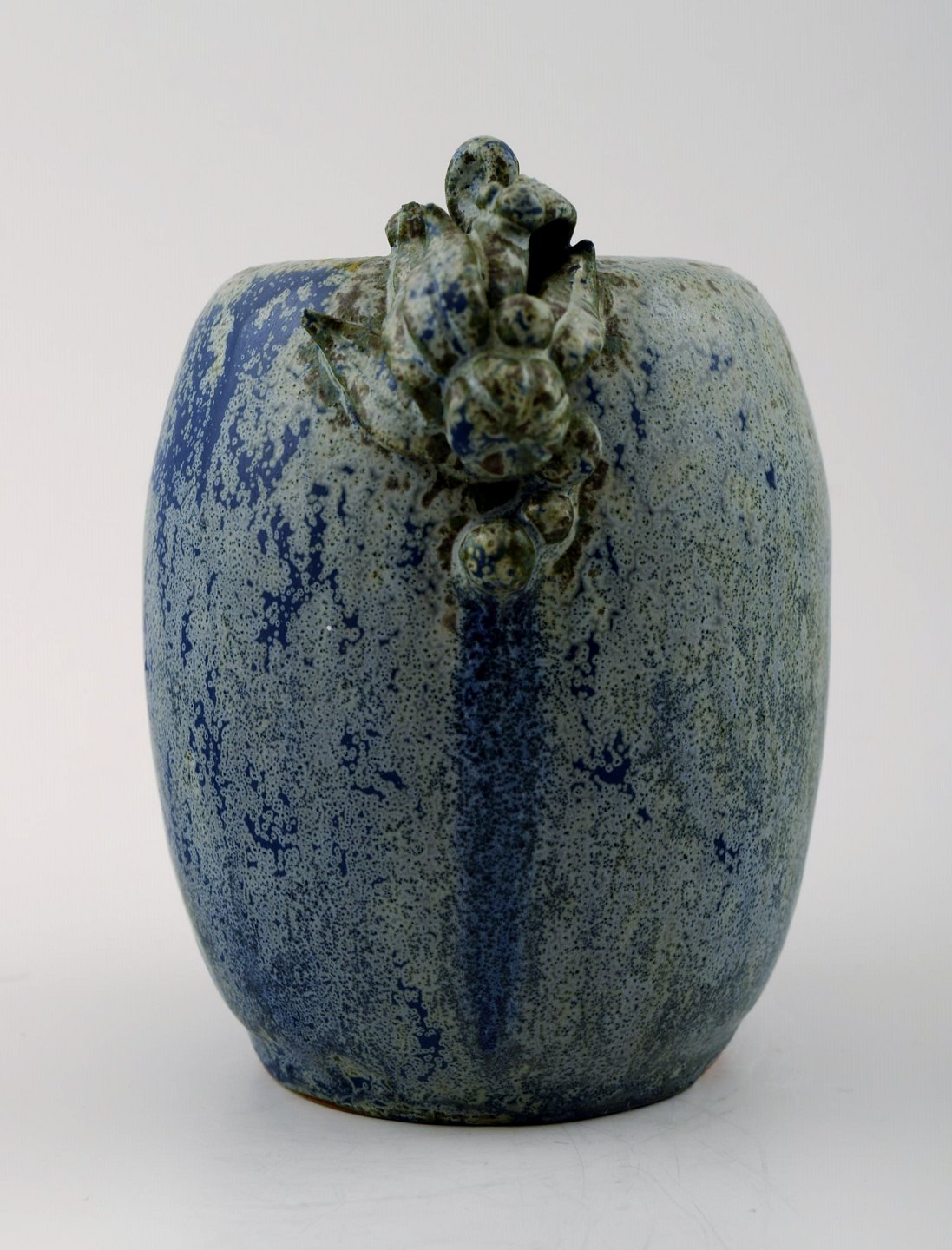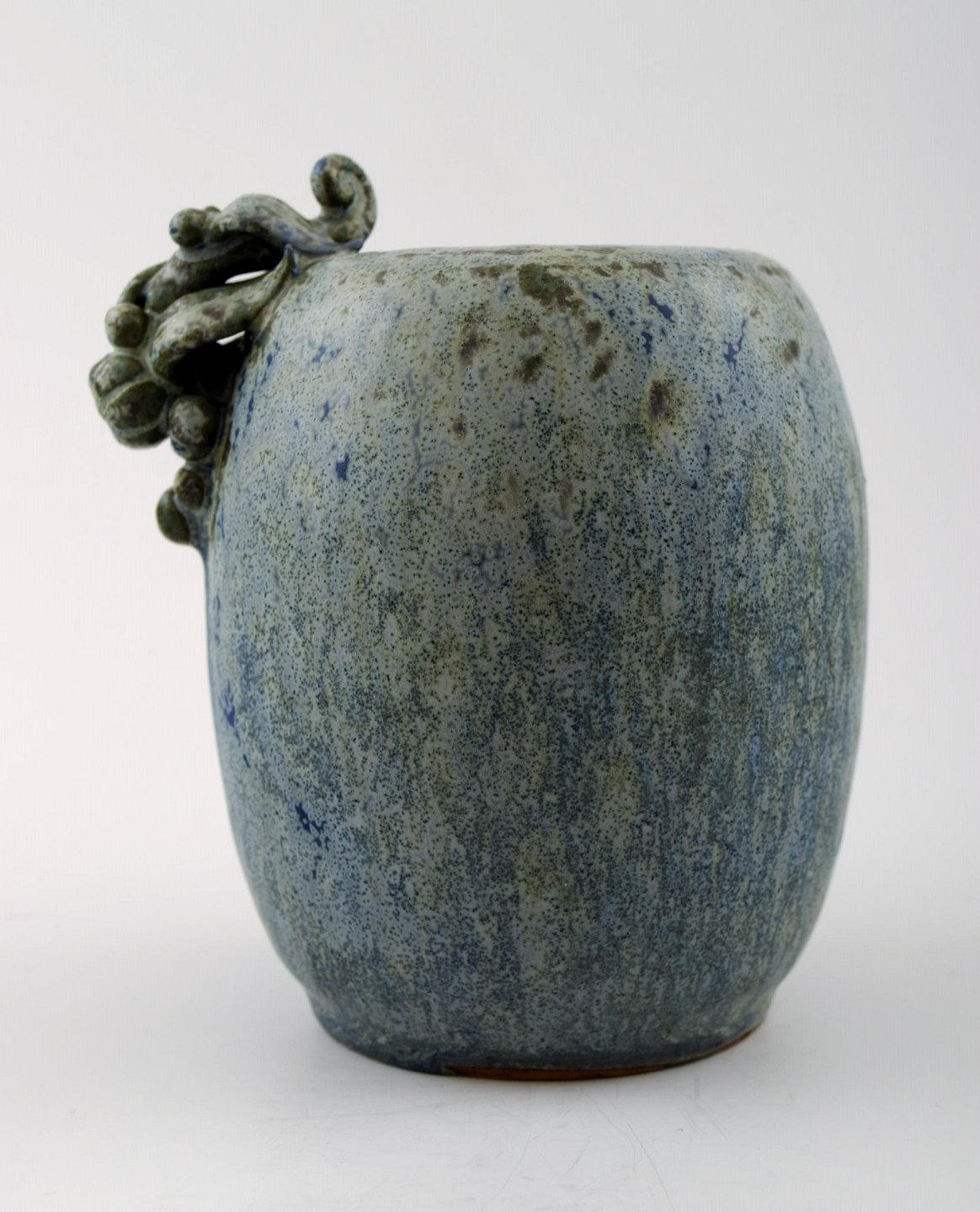 Arne Bang. Keramik vase med bladværk. Stemplet AB . Flot glasur i blå nuancer. I perfekt stand. Måler: 10,5 cm. x 9.5 cm.