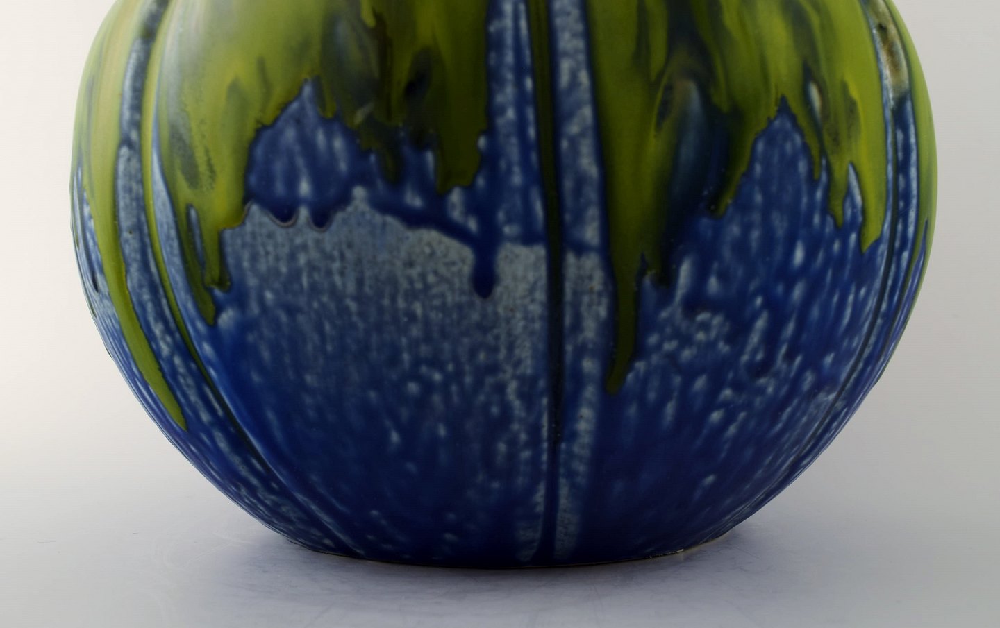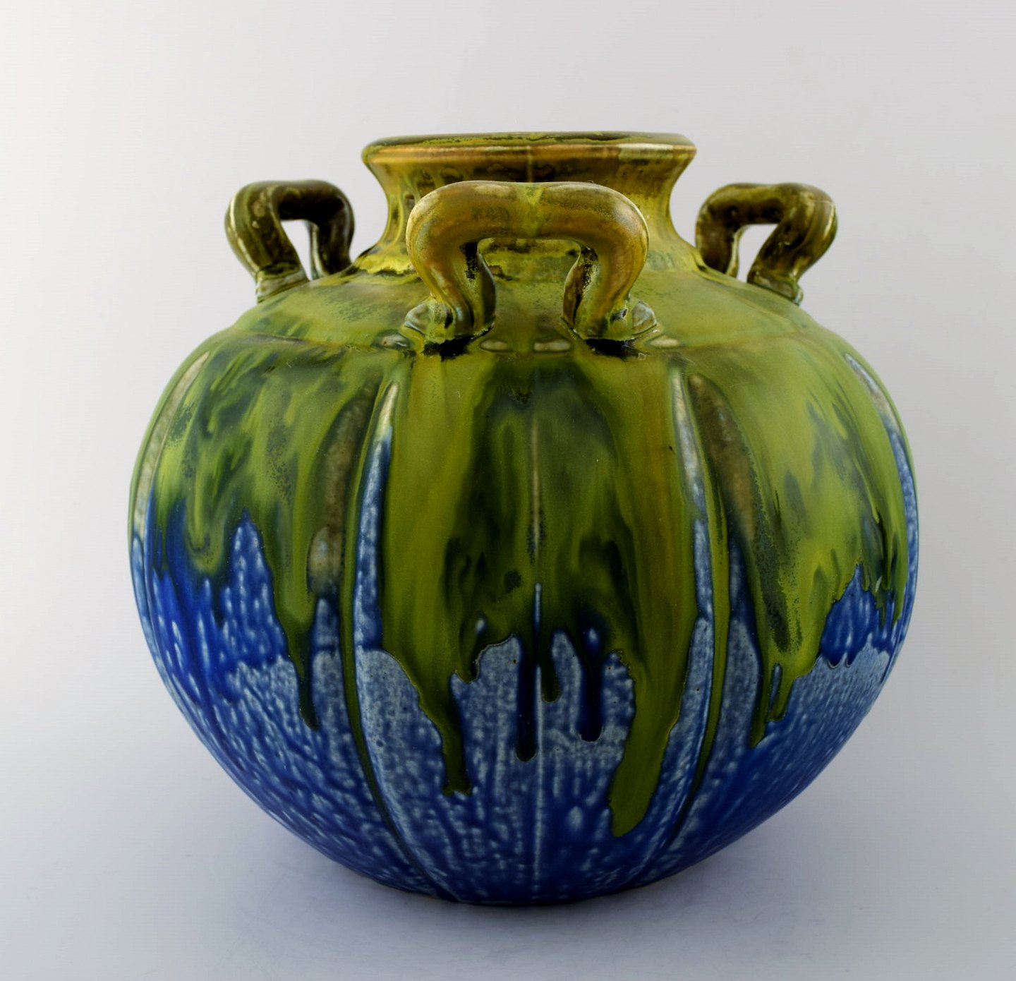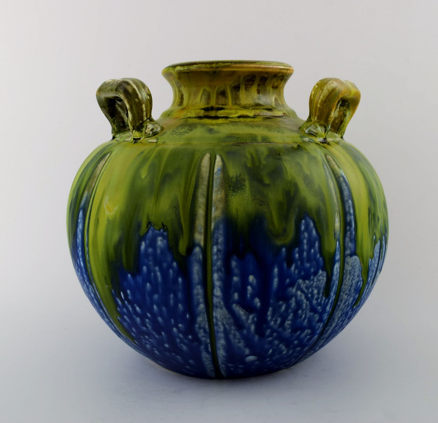 Gilbert Metenier, fransk keramiker. Art Deco vase med hanke i blå og grøn glasur. 1920-30´erne.