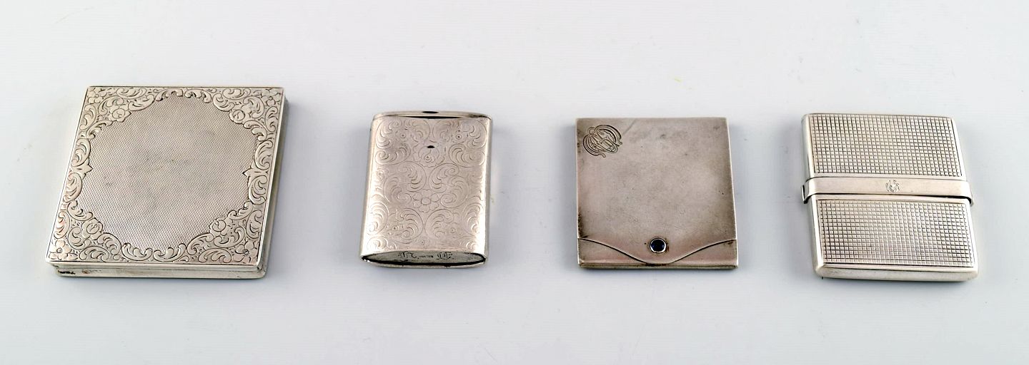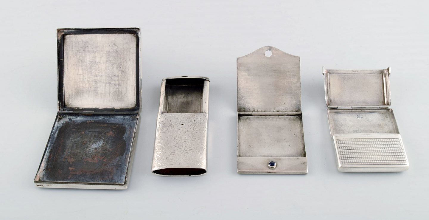 Fire tændstikæskeholdere i sølv (.830) Tidligt 20 årh. Stemplet. I flot stand. Måler : 7 cm. x 7 cm. (største)