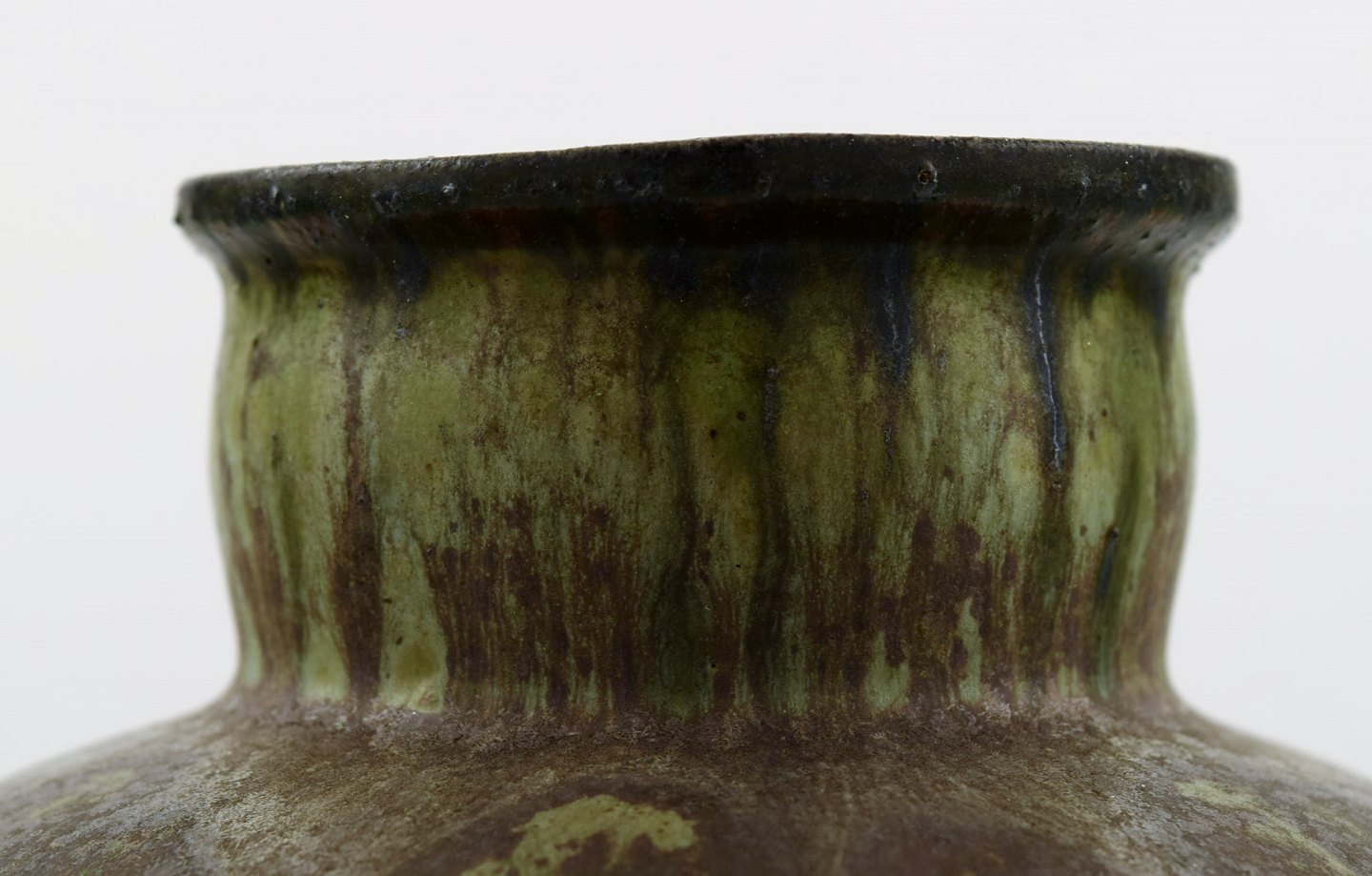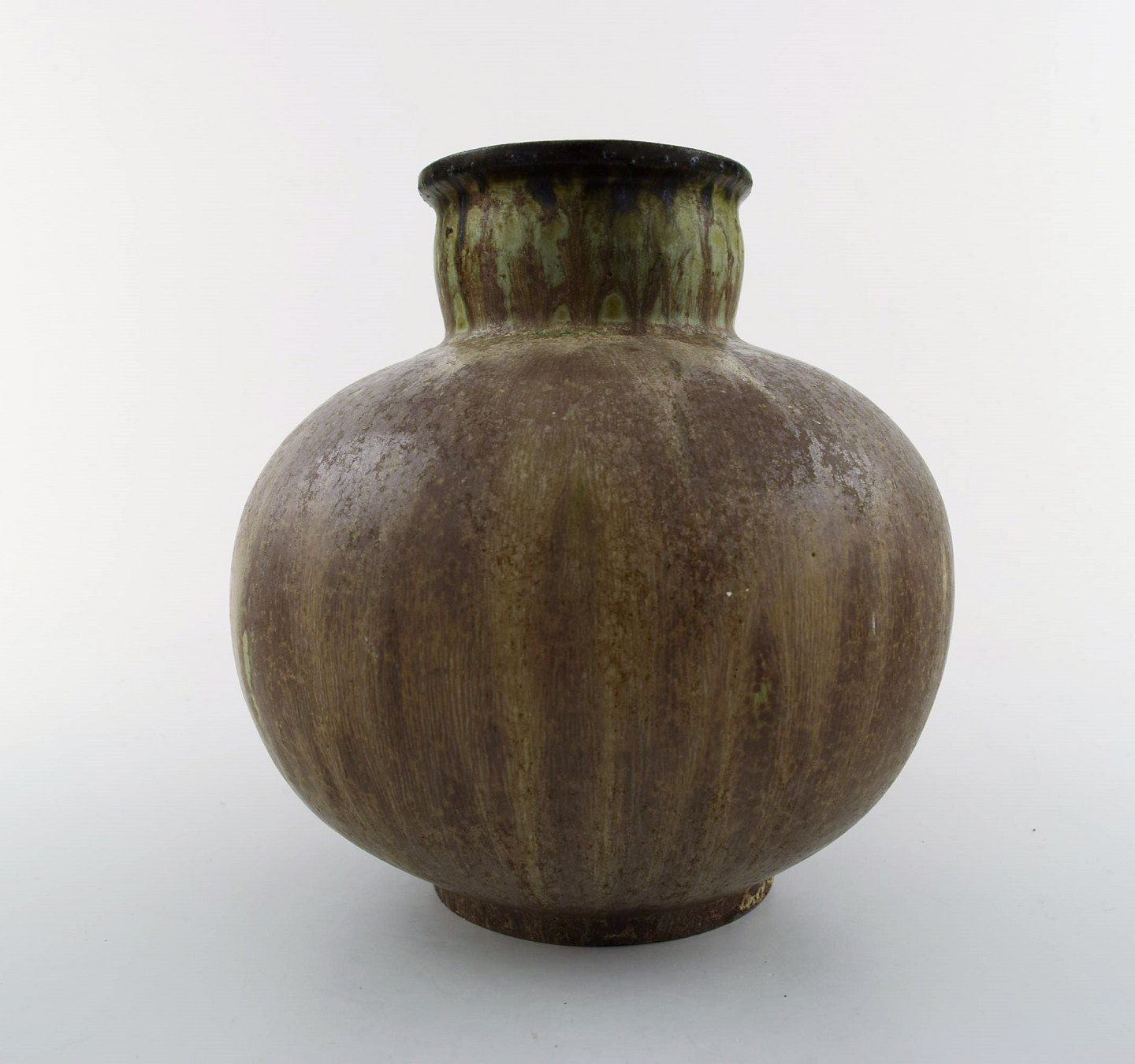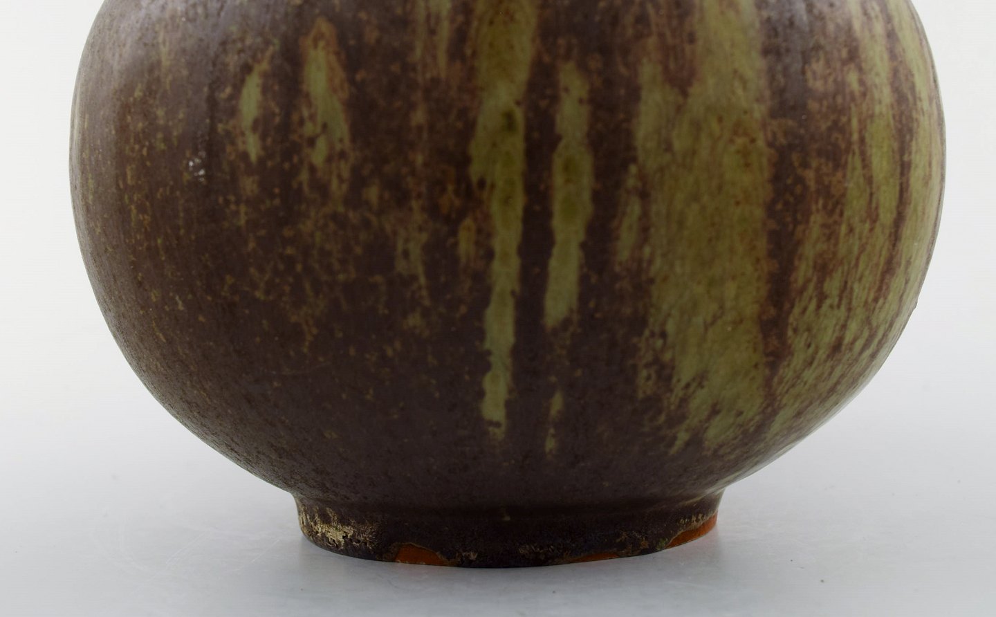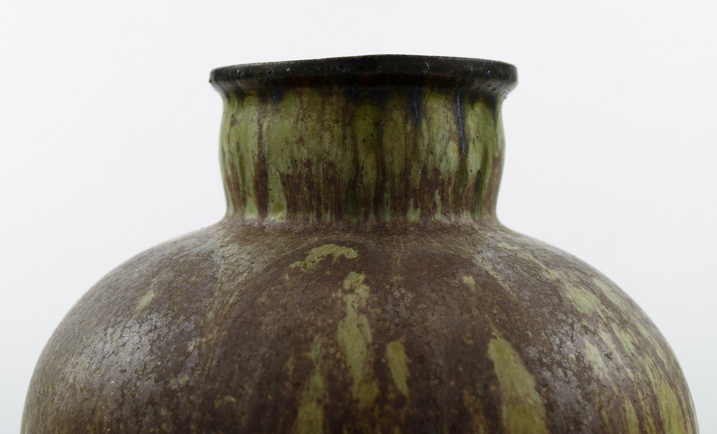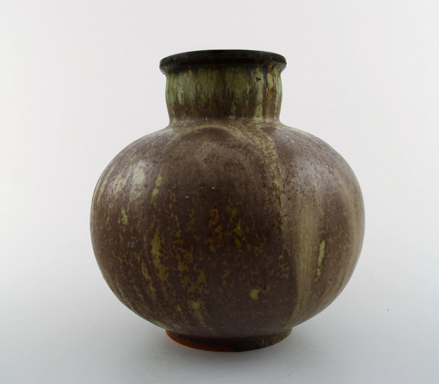 Sjælden og tidlig Arne Bang for Holmegaard keramikvase. 1930´erne. Stemplet HG 44. Glasur i brune og jordfarvet nuancer. I perfekt stand. Måler: 17 x 16 cm.