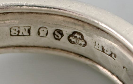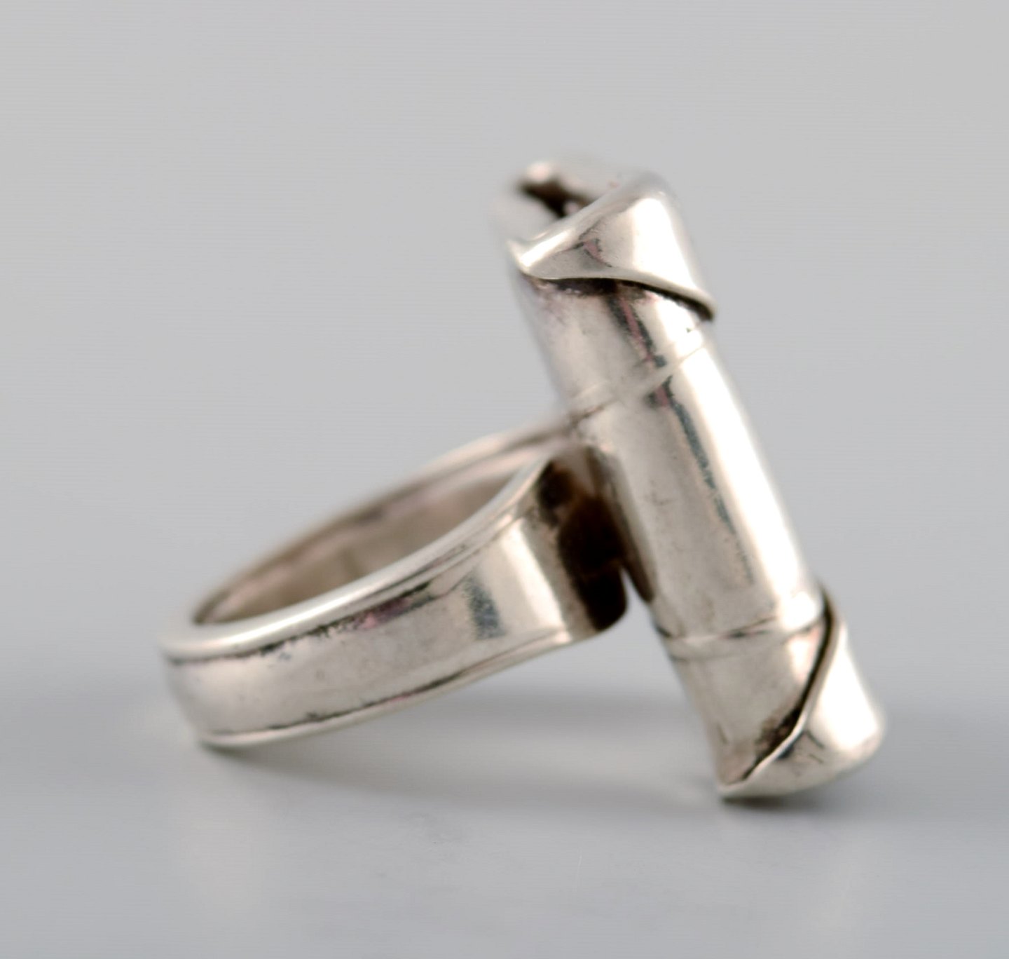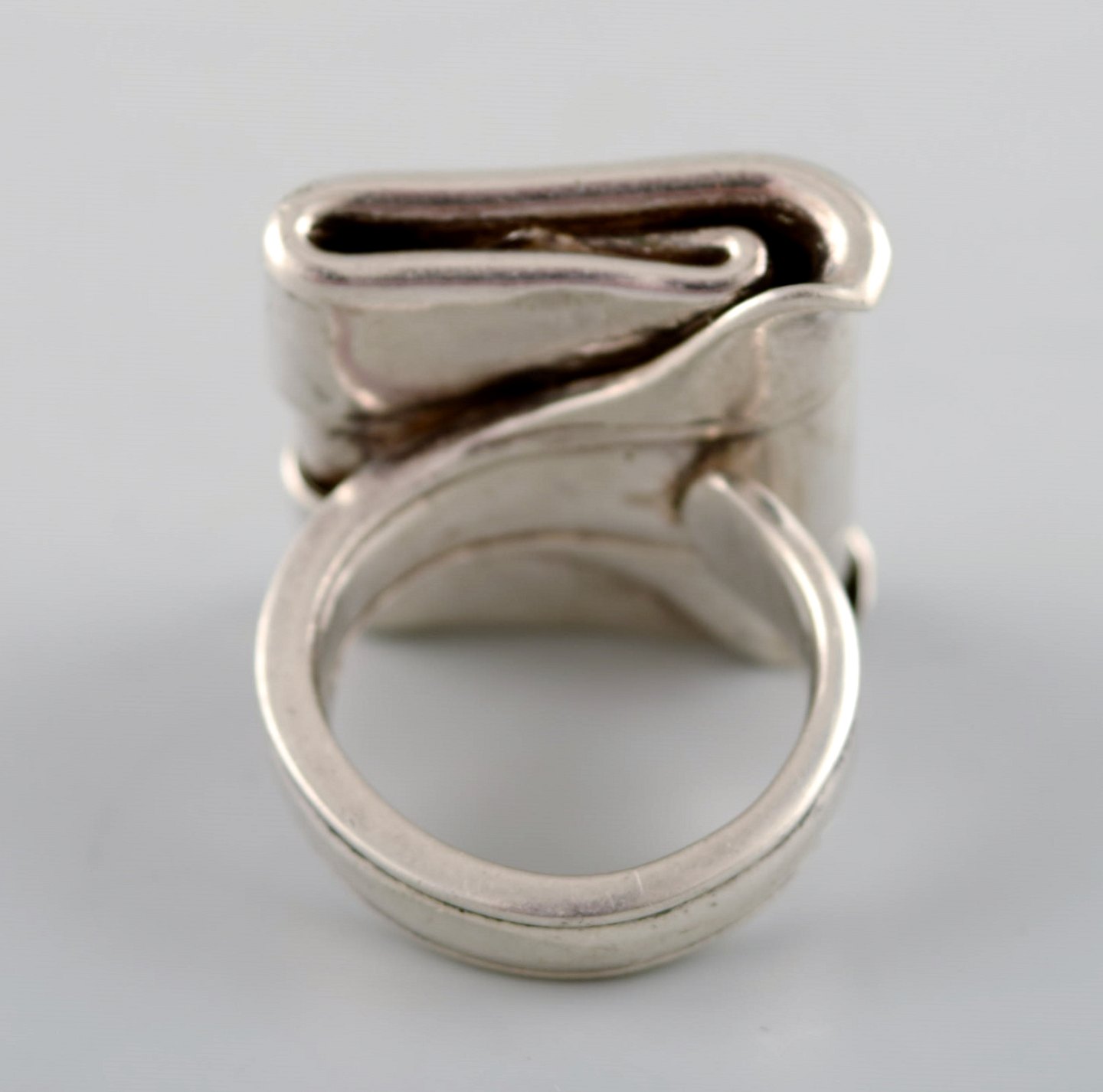 Svensk sølvring i moderne design, organisk form. Størrelse : 20 mm. Vores sølvsmed kan ændre til alle størrelser for kr. 300.- Stemplet. N8 for 1939. I flot stand.