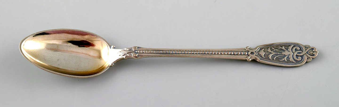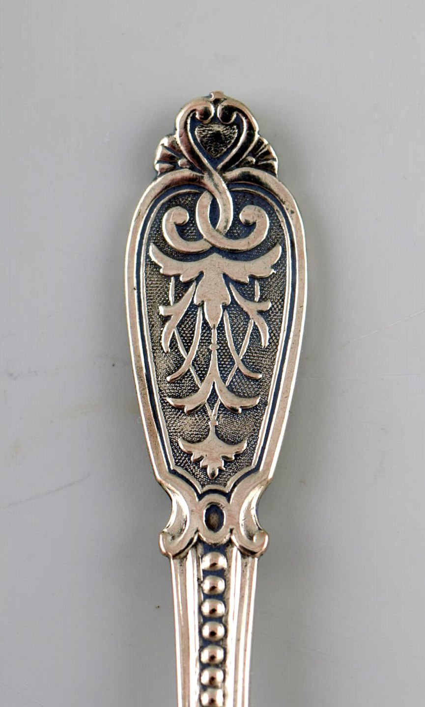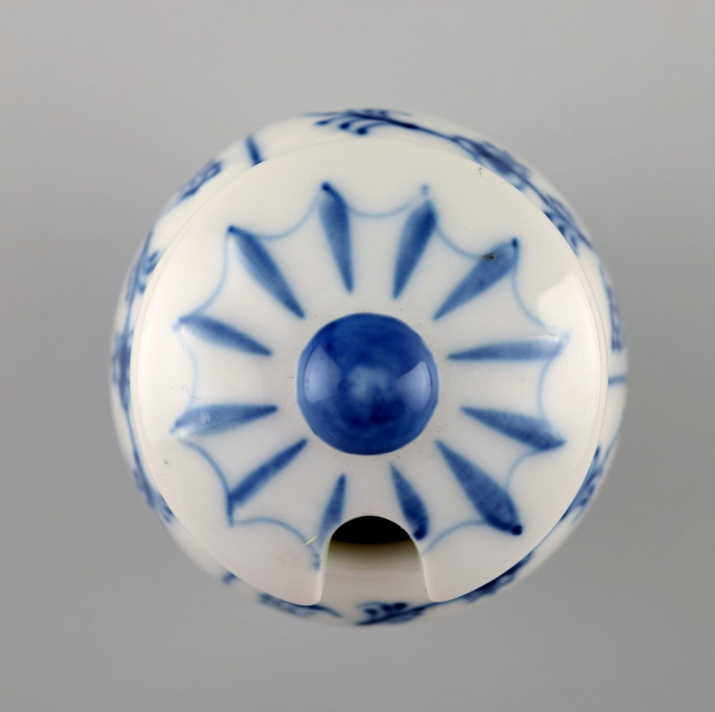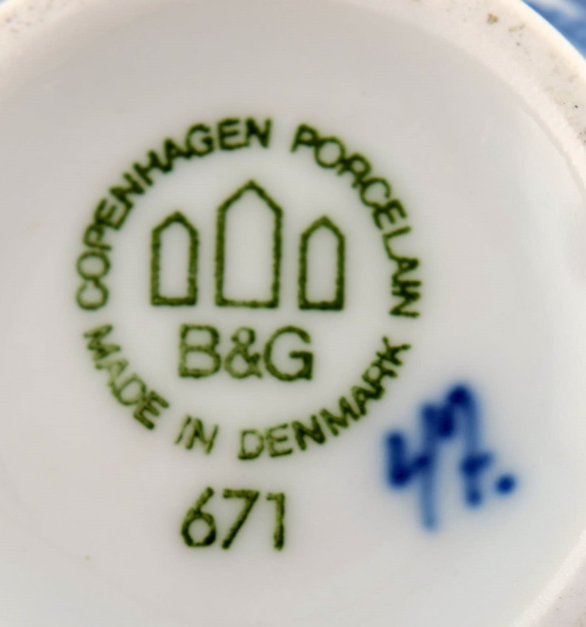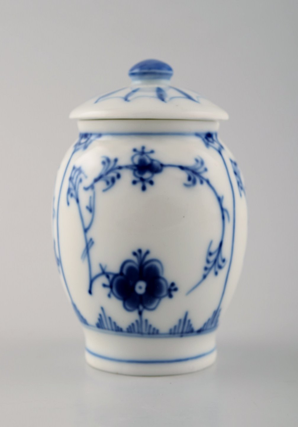 Sjælden Bing & Grøndahl, B&G musselmalet. Sennepskrukke med sølvske. Måler : 8 x 5 cm. Nr. 671. 1. sortering, i perfekt stand.