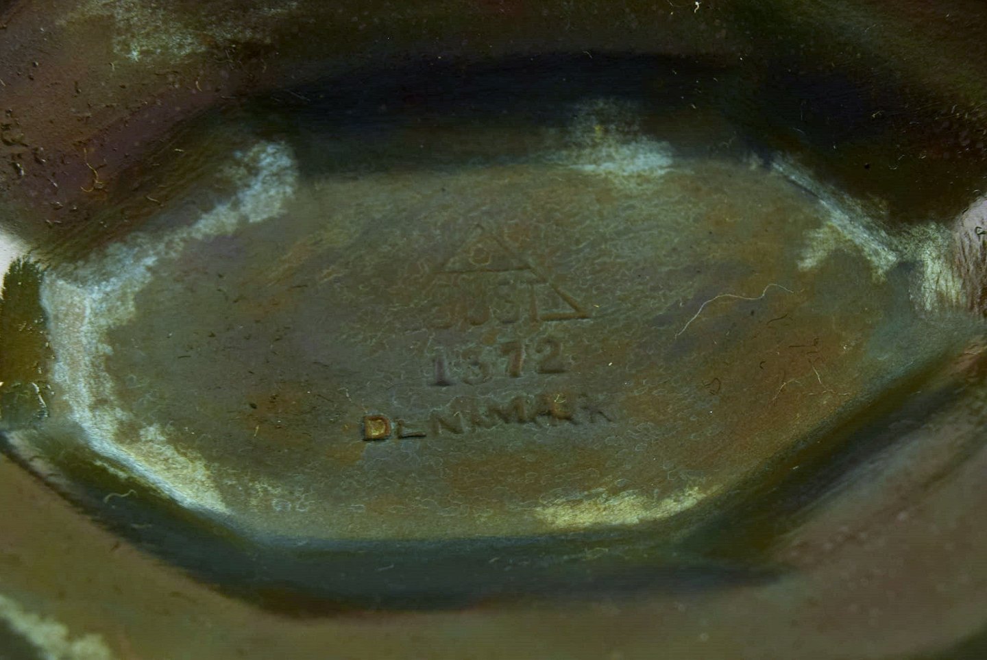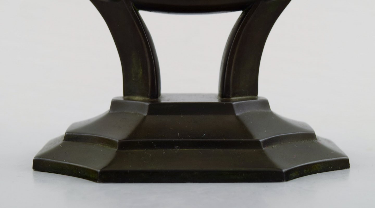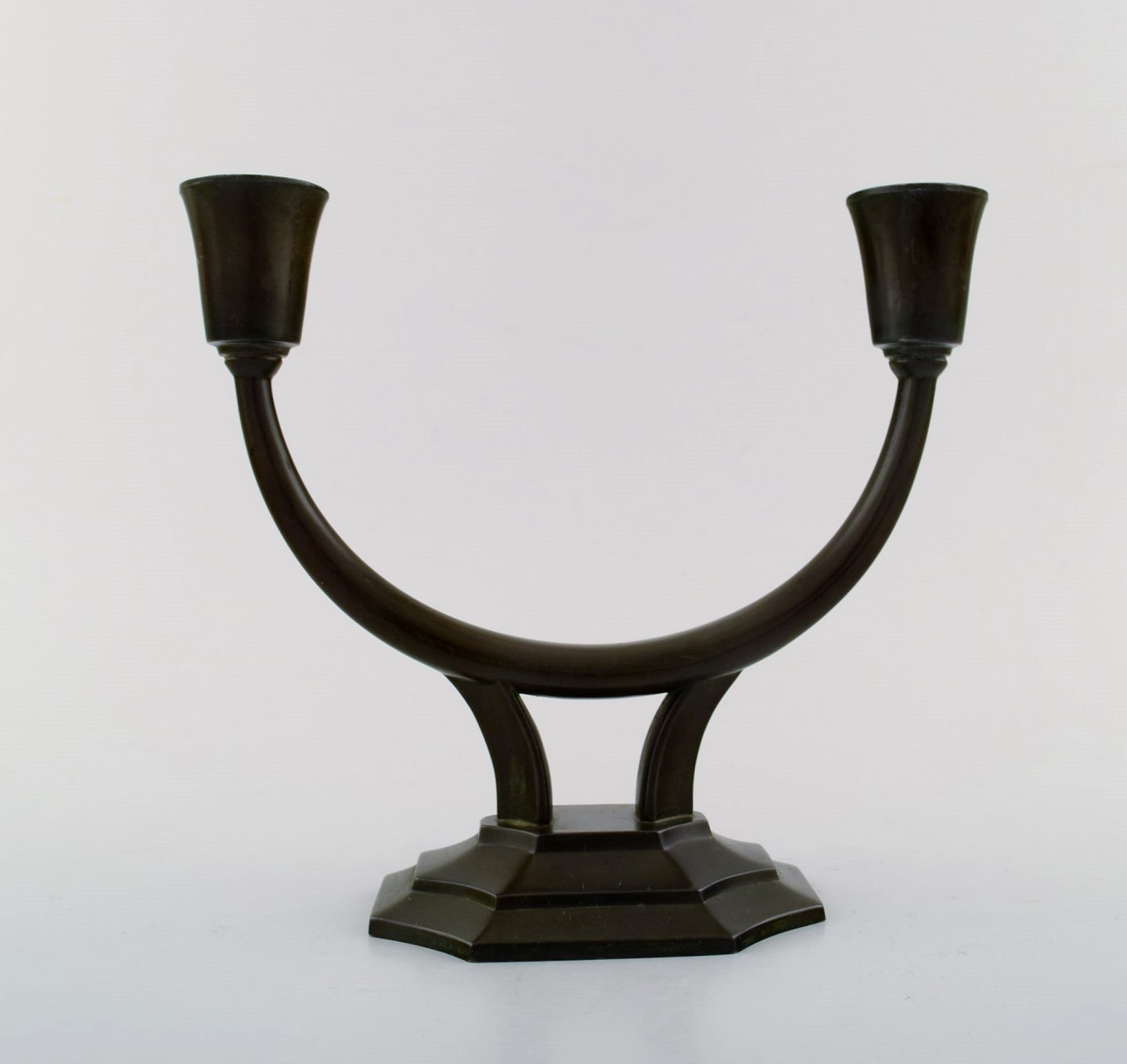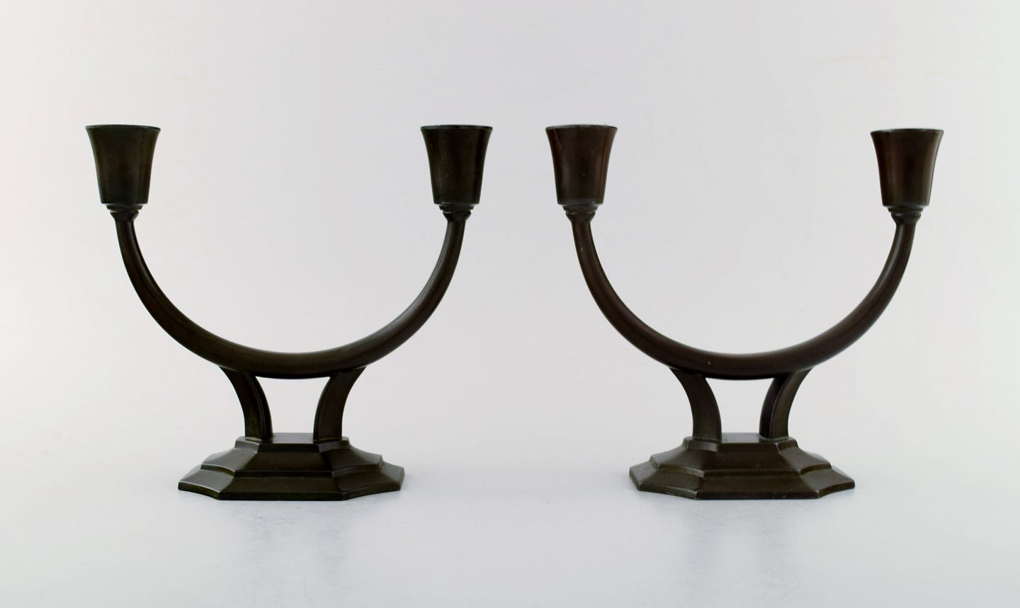 Just Andersen art deco par "disko" metal lysestager, nummer 1372. Stemplet. Fremstår i flot stand med god patina. Måler 19 cm. x 17 cm.