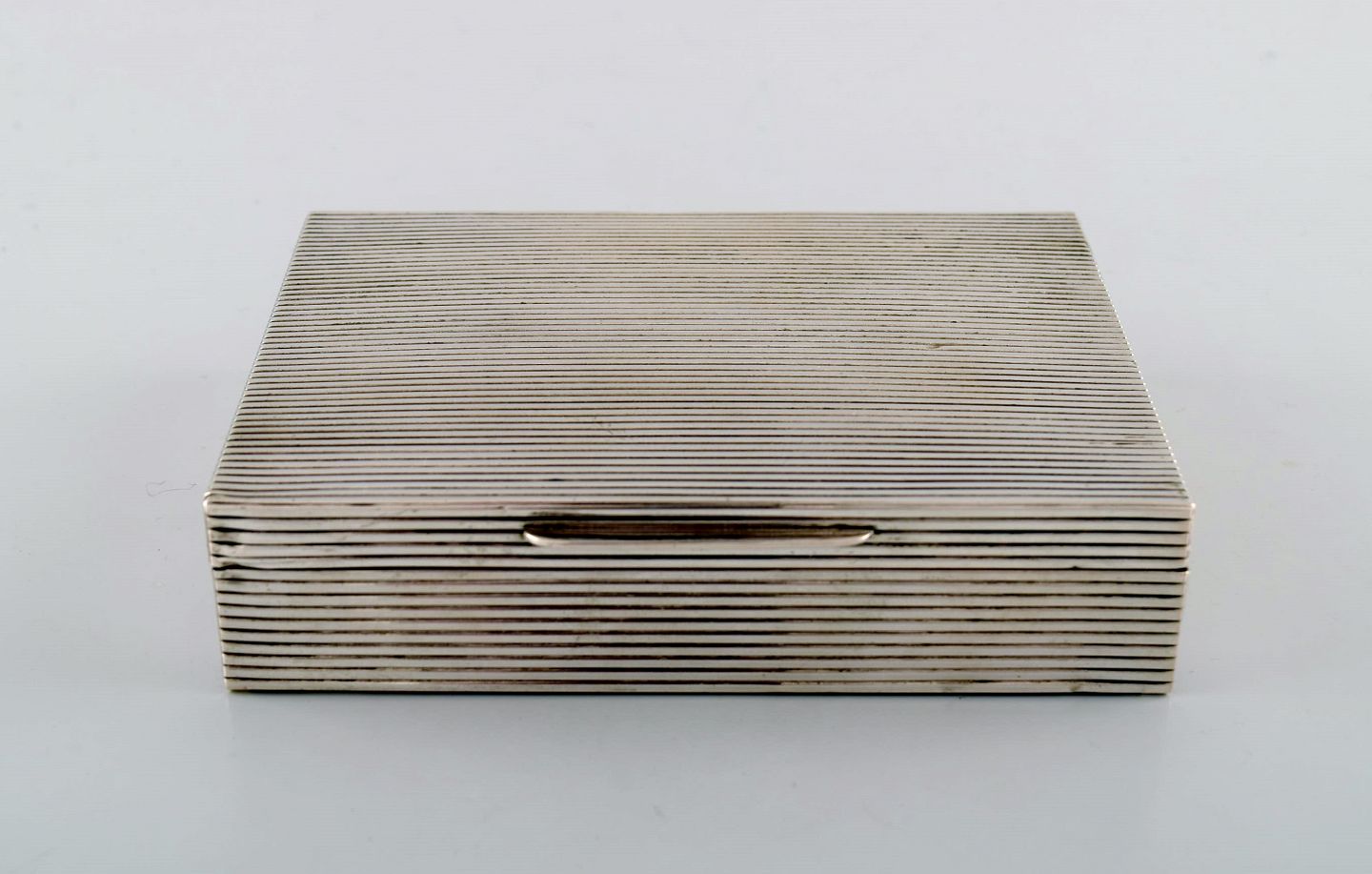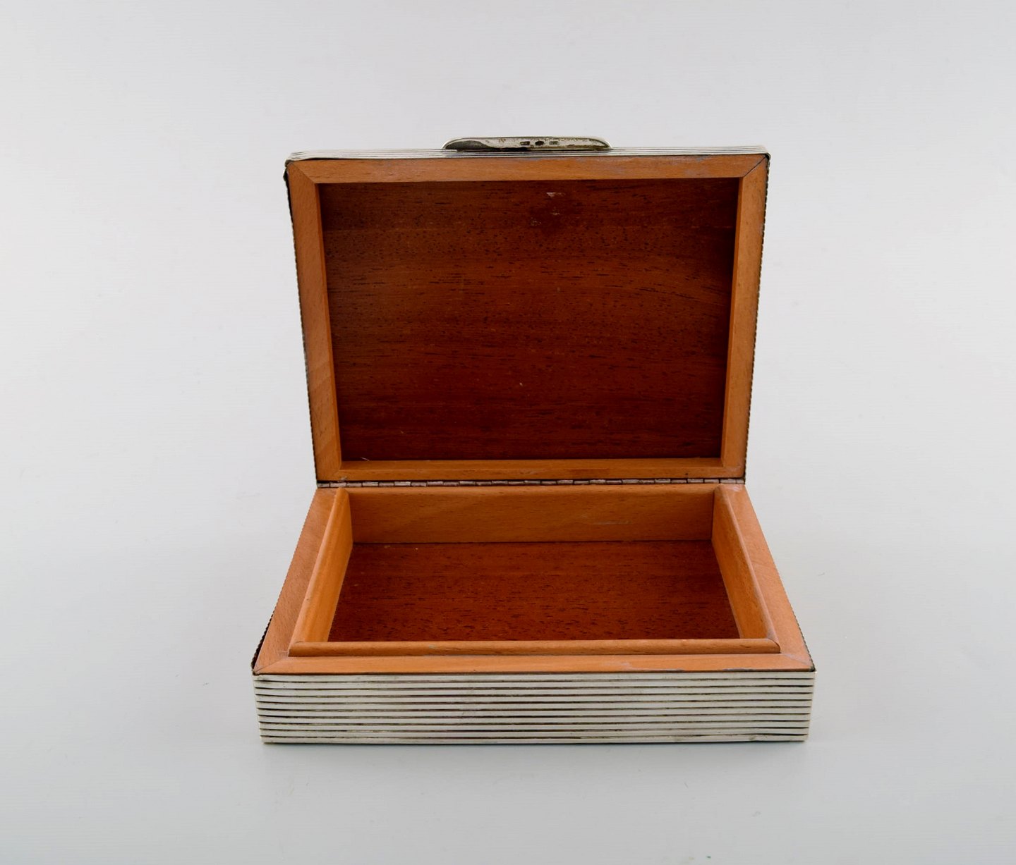 Svensk art deco sølvskrin med indlæg i træ. Smukt stilrent design. 1940'erne. I flot stand. Måler: 13,5 cm x 11 cm x 3,5 cm. Stemplet.