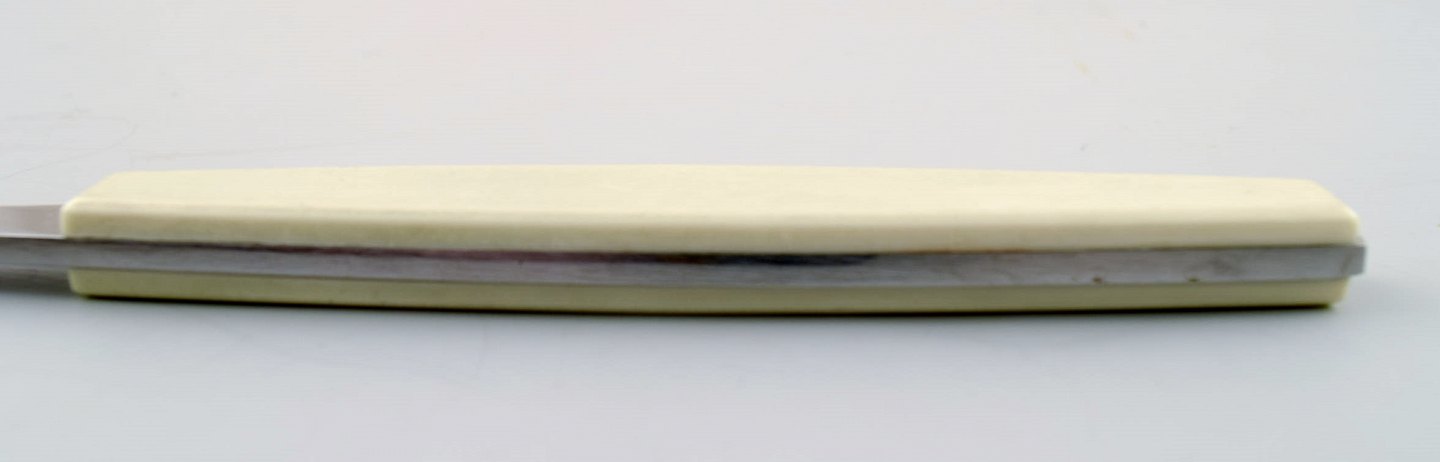 4 stk. Middagskniv. Henning Koppel. Strata bestik af rustfrit stål og hvid plast. 4 stk. på lager. Fremstillet hos Georg Jensen. I flot stand. Dansk design 1970´erne. 20,5 cm. lange.