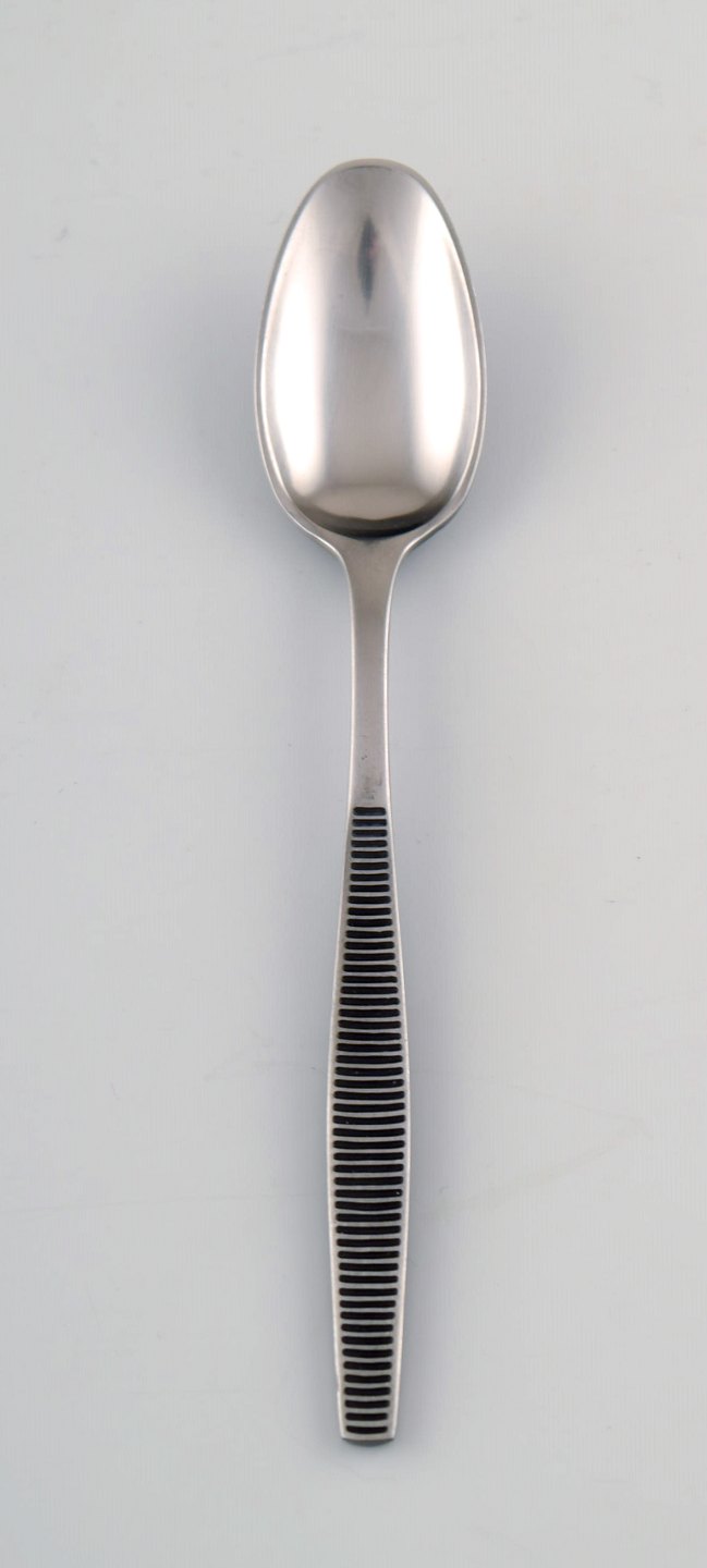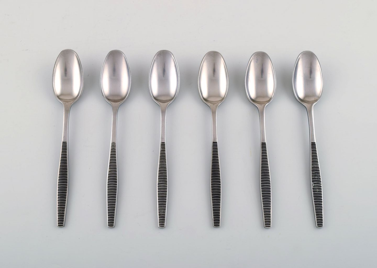 Sæt på seks skeer, Jens H. Quistgaard "Variation VI" bestik af håndsmedet rustfrit stål. Måler : 16,5 cm. Stemplet : "Dansk Designs Denmark IHQ". Formgivet ca. 1960. I god stand.