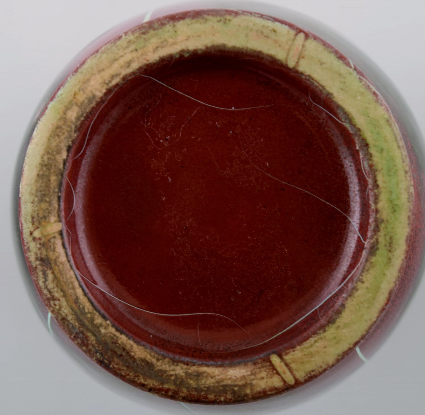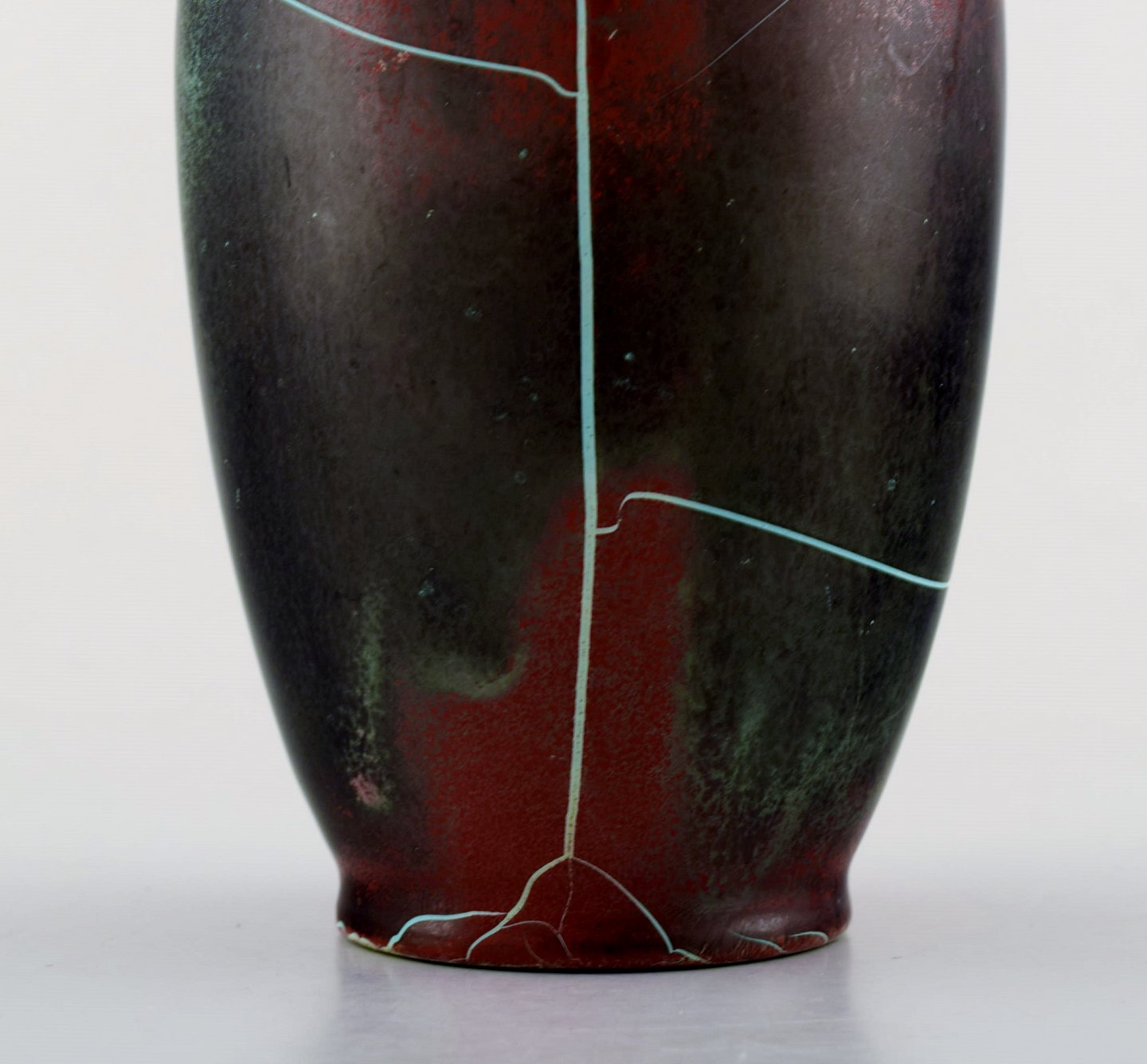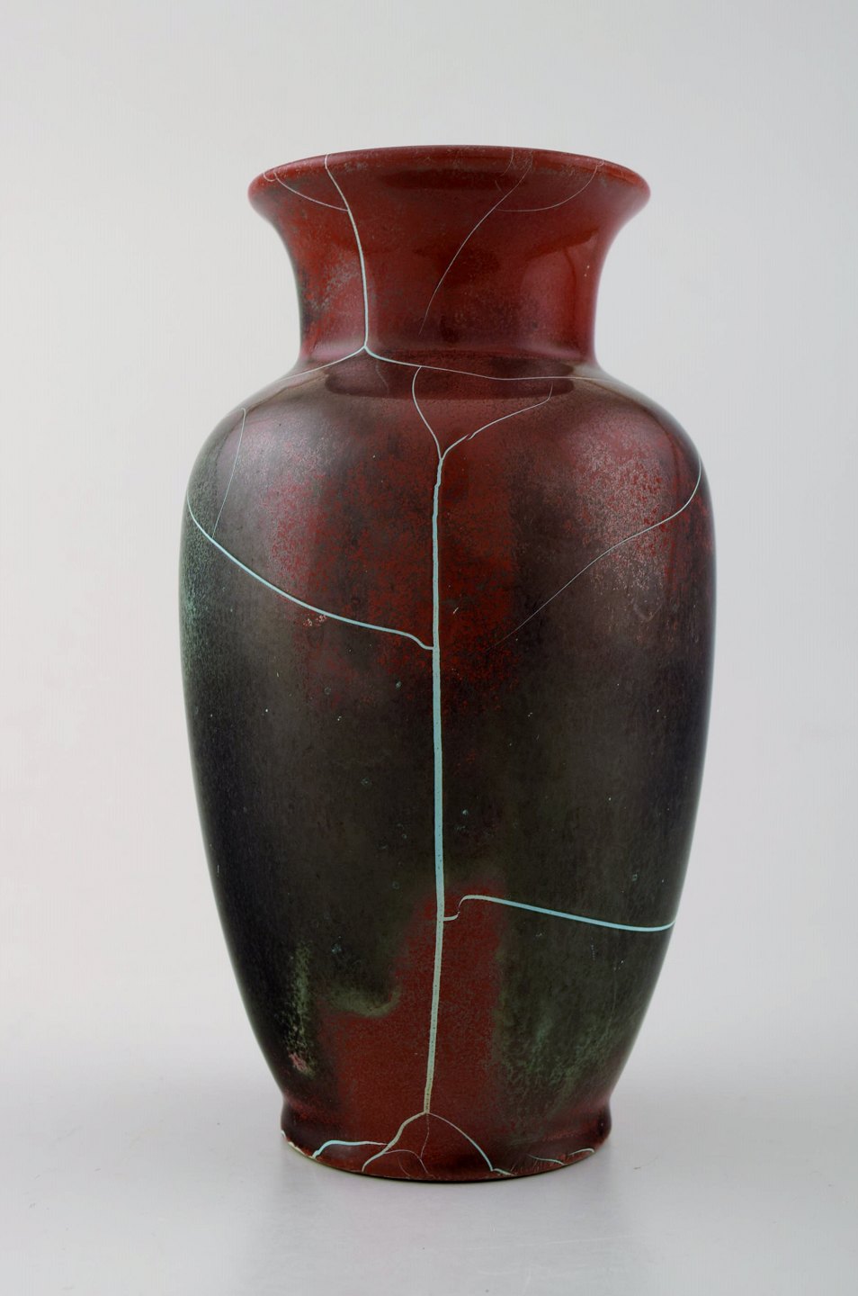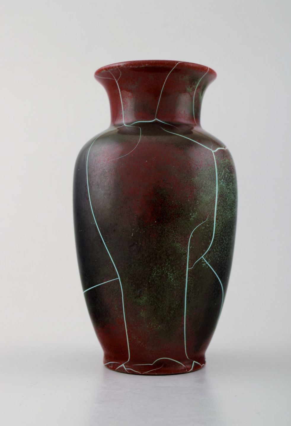 Richard Uhlemeyer, tysk keramiker. Keramikvase, smuk krakeleret glasur i grøn røde nuancer. Tyskland, 1950´erne. Måler 19 cm. x 10,5 cm. I perfekt stand. Stemplet.