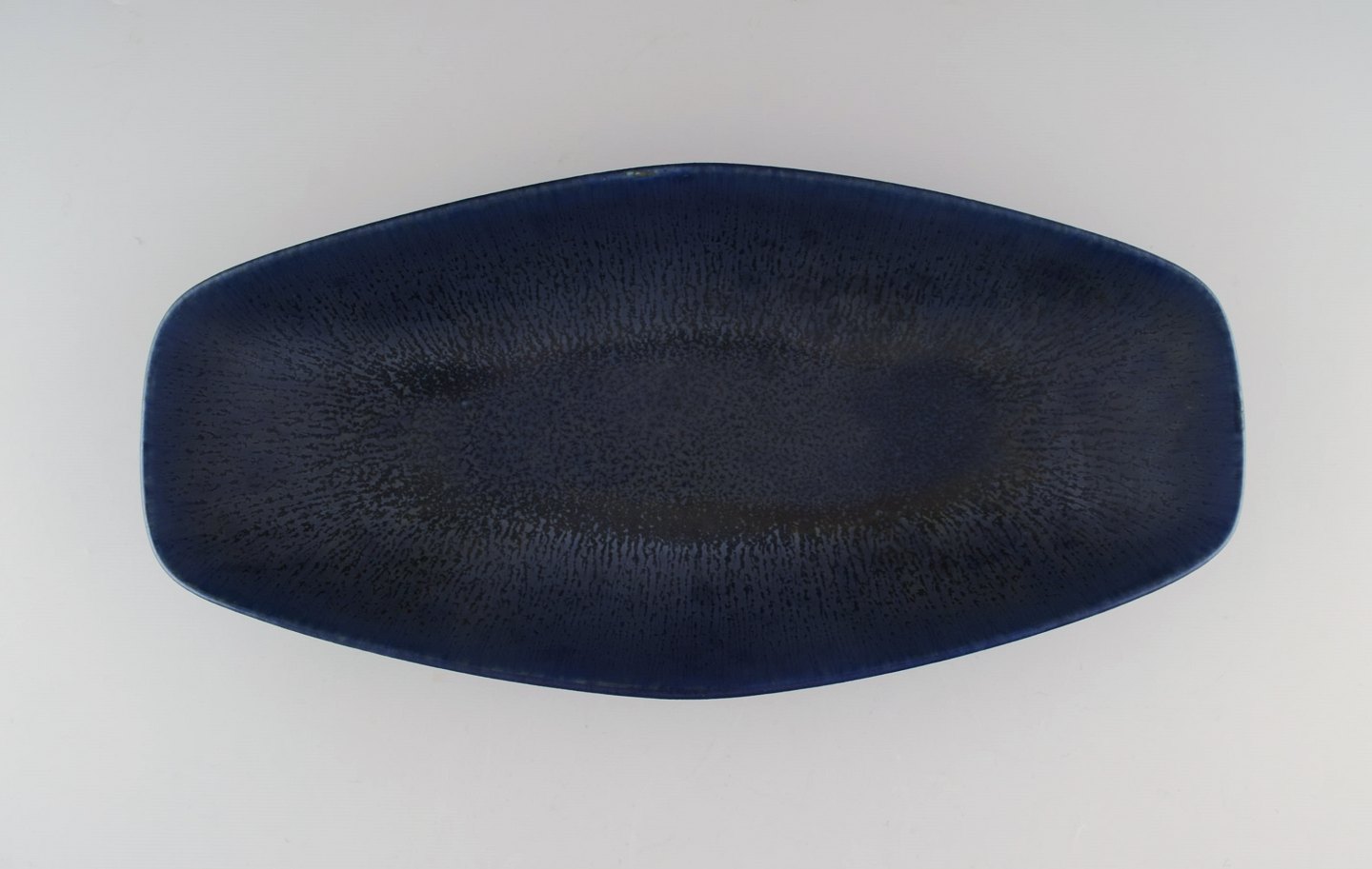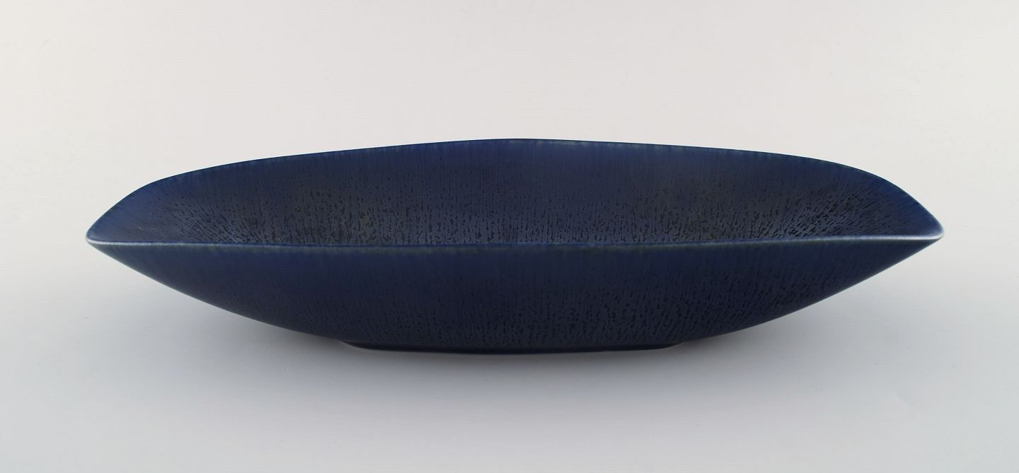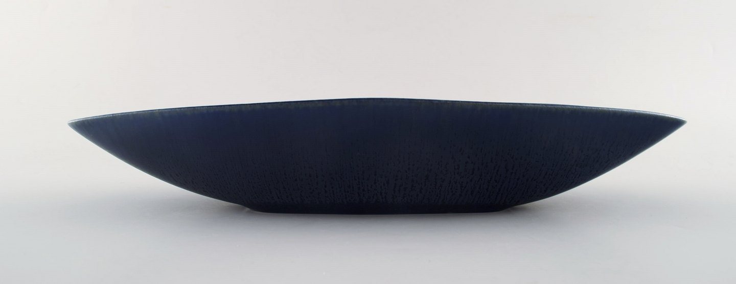 Carl-Harry Stålhane, Rørstrand/Rörstrand, stor skål i stentøj. Smuk glasur i blå nuancer. Længde 31,5 cm. Bredde 13,5 cm. 5,5 cm. høj. I perfekt stand, 2. sortering.