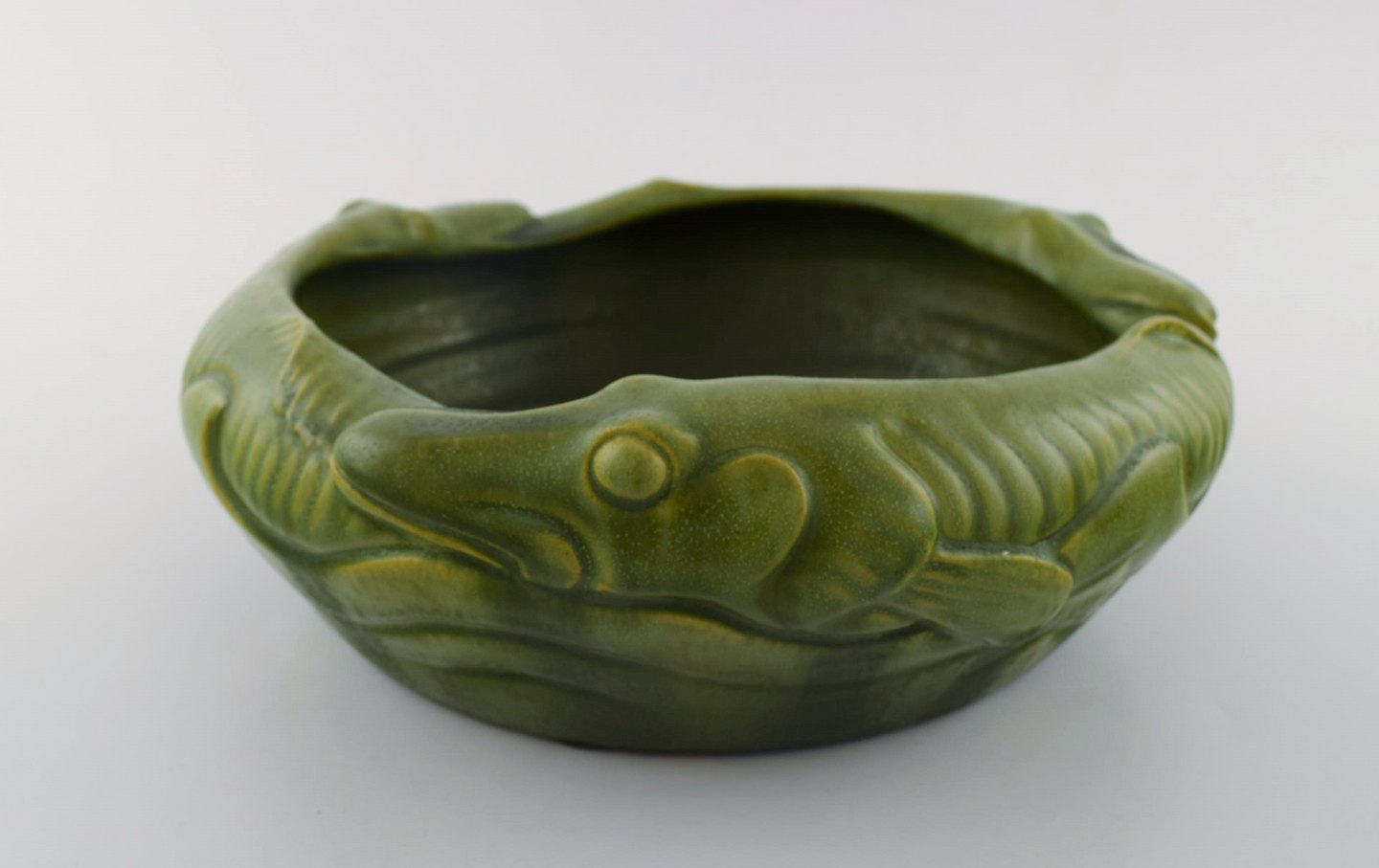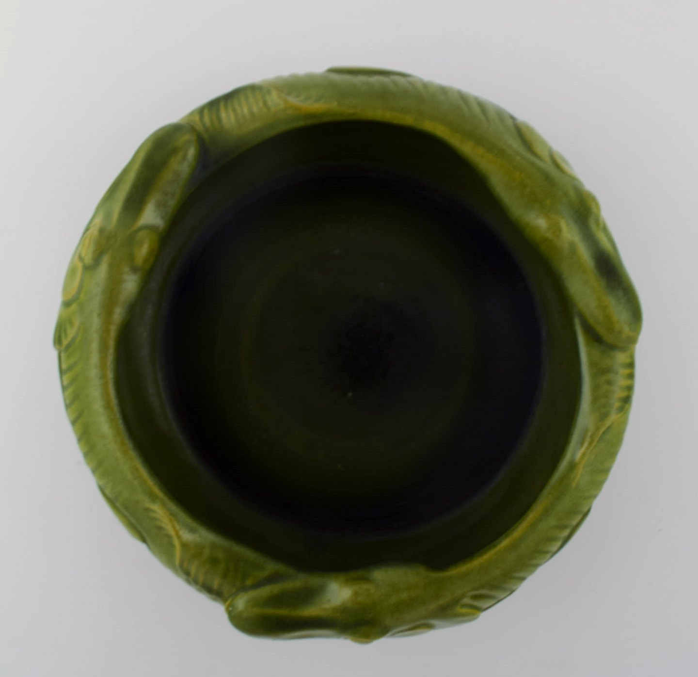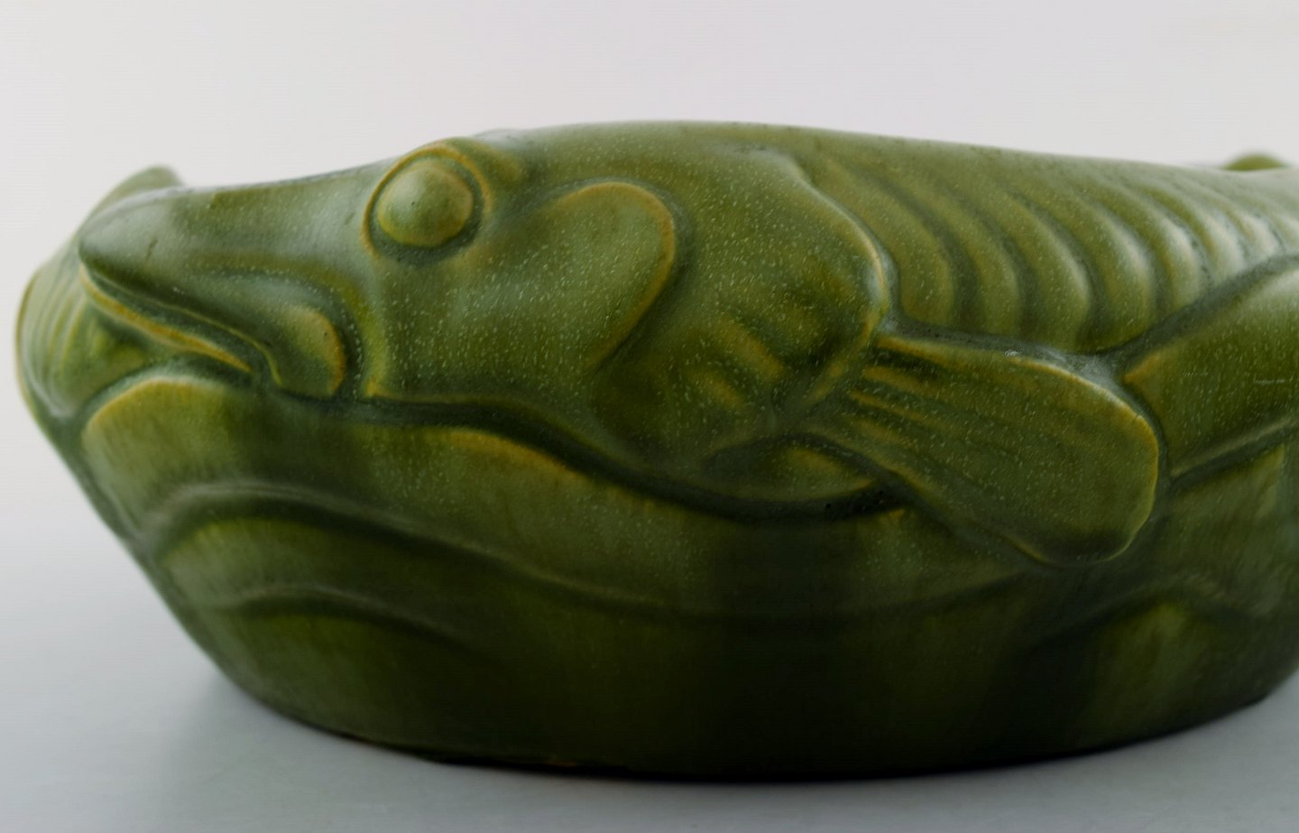Karl Hansen Reistrup for Kähler, skål med gedder. Smuk glasur i grønne nuancer. Tidligt 1900-tallet. I flot stand. Måler 27 cm x 8,5 cm. Stemplet.