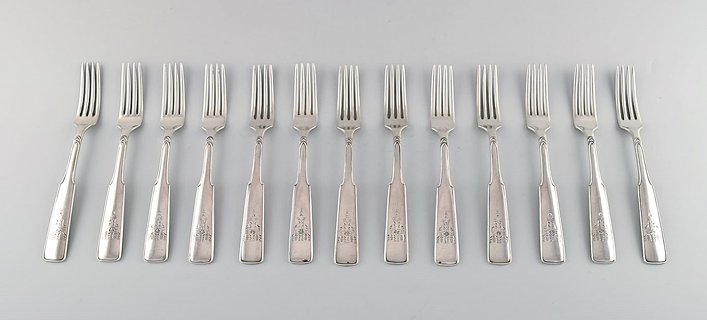 Hans Hansen sølvtøj Arvesølv nr. 2. 13 stk frokostgafler i 3-tårnet helsølv. Måler : 18 cm. Perfekt stand. Stemplet. 13 stk. på lager