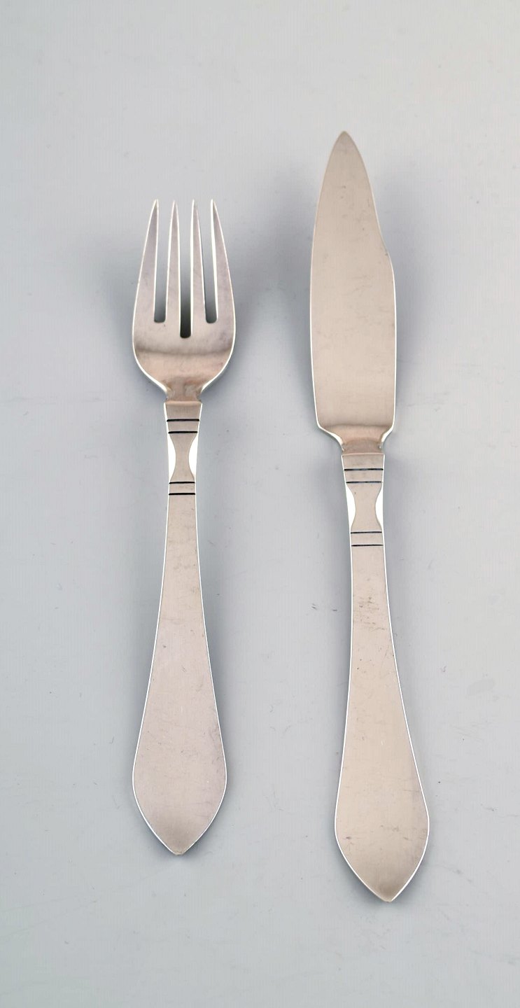 Georg Jensen Antik Sterlingsølv, komplet 12-personers fiskeservice i helsølv. Kniv måler: 21 cm. Stemplet. 1933-1944. I flot stand.