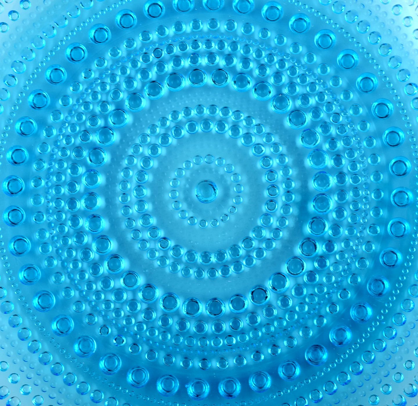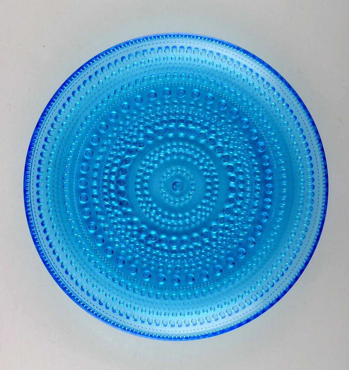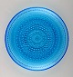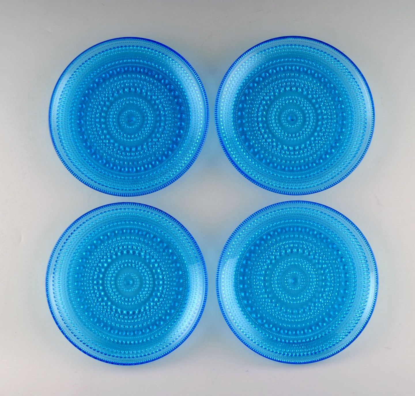 OIVA TOIKKA for Nuutajärvi, "Kastehelmi" fire tallerkener i blåt kunstglas. Finsk design 1960-1970´erne. Måler 17,5 cm x 2,5 cm. I perfekt stand.