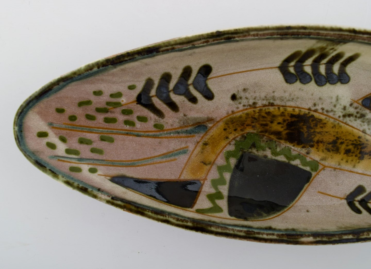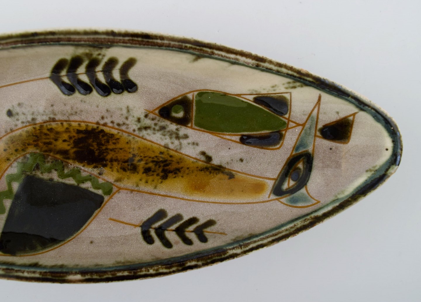 Dekoreret med fiskemotiver i grønt, gult, sort og rødbrunt.